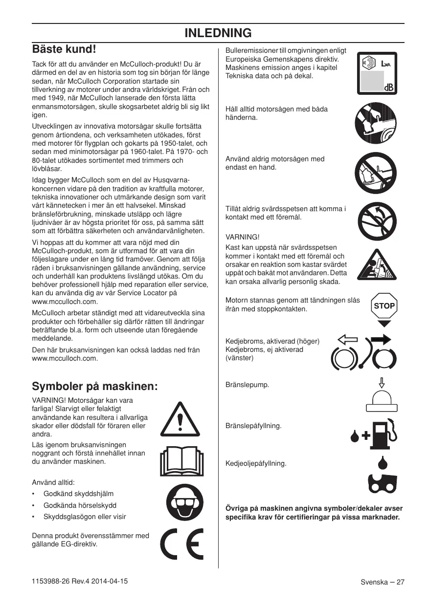 - of December 15, 2004 ”relating to electromagnetic compatibility” 2004/108/EC. - of May 8, 2000 ”relating to the noise emissions in the environment” 2000/14/EC. Conformity assessment procedure according to Annex V of the above directive has been used. For information relating to noise emissions, see the chapter Technical data. The following standards have been applied: EN ISO 12100-2/A1:2009, CISPR 12:2007, EN ISO 11681-1:2008 Notified body: 0404, SMP Svensk Maskinprovning AB, Fyrisborgsgatan 3, SE-754 50 Uppsala, Sweden, has carried out EC type examination in accordance with the machinery directive’s (2006/42/EC) article 12, point 3b. The certificates for EC type examination in accordance with annex IX, have the numbers: 0404/11/2298. The supplied chain saw conforms to the example that underwent EC type examination. Huskvarna March 1, 2011 Ronnie E. Goldman, Director of Engineering. (Authorized representative for Husqvarna AB and responsible for technical documentation.) 26 – English 1153988-26 Rev.4 2014-04-15 INLEDNING Bäste kund! Tack för att du använder en McCulloch-produkt! Du är därmed en del av en historia som tog sin början för länge sedan, när McCulloch Corporation startade sin tillverkning av motorer under andra världskriget. Från och med 1949, när McCulloch lanserade den första lätta enmansmotorsågen, skulle skogsarbetet aldrig bli sig likt igen. Utvecklingen av innovativa motorsågar skulle fortsätta genom årtiondena, och verksamheten utökades, först med motorer för flygplan och gokarts på 1950-talet, och sedan med minimotorsågar på 1960-talet. På 1970- och 80-talet utökades sortimentet med trimmers och lövblåsar. Idag bygger McCulloch som en del av Husqvarnakoncernen vidare på den tradition av kraftfulla motorer, tekniska innovationer och utmärkande design som varit vårt kännetecken i mer än ett halvsekel. Minskad bränsleförbrukning, minskade utsläpp och lägre ljudnivåer är av högsta prioritet för oss, på samma sätt som att förbättra säkerheten och användarvänligheten. Vi hoppas att du kommer att vara nöjd med din McCulloch-produkt, som är utformad för att vara din följeslagare under en lång tid framöver. Genom att följa råden i bruksanvisningen gällande användning, service och underhåll kan produktens livslängd utökas. Om du behöver professionell hjälp med reparation eller service, kan du använda dig av vår Service Locator på www.mcculloch.com. McCulloch arbetar ständigt med att vidareutveckla sina produkter och förbehåller sig därför rätten till ändringar beträffande bl.a. form och utseende utan föregående meddelande. Den här bruksanvisningen kan också laddas ned från www.mcculloch.com. Symboler på maskinen: VARNING! Motorsågar kan vara farliga! Slarvigt eller felaktigt användande kan resultera i allvarliga skador eller dödsfall för föraren eller andra. Läs igenom bruksanvisningen noggrant och förstå innehållet innan du använder maskinen. Bulleremissioner till omgivningen enligt Europeiska Gemenskapens direktiv. Maskinens emission anges i kapitel Tekniska data och på dekal. Håll alltid motorsågen med båda händerna. Använd aldrig motorsågen med endast en hand. Tillåt aldrig svärdsspetsen att komma i kontakt med ett föremål. VARNING! Kast kan uppstå när svärdsspetsen kommer i kontakt med ett föremål och orsakar en reaktion som kastar svärdet uppåt och bakåt mot användaren. Detta kan orsaka allvarlig personlig skada. Motorn stannas genom att tändningen slås ifrån med stoppkontakten. Kedjebroms, aktiverad (höger) Kedjebroms, ej aktiverad (vänster) Bränslepump. Bränslepåfyllning. Kedjeoljepåfyllning. Använd alltid: