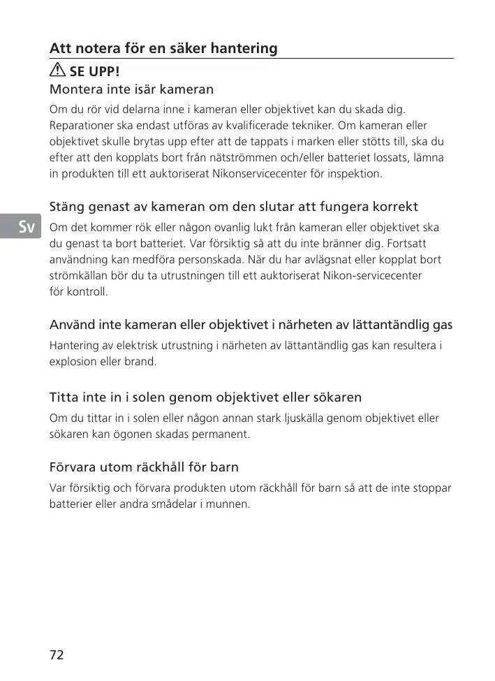 SE UPP! Montera inte isär kameran Om du rör vid delarna inne i kameran eller objektivet kan du skada dig. Reparationer ska endast utföras av kvalificerade tekniker. Om kameran eller objektivet skulle brytas upp efter att de tappats i marken eller stötts till, ska du efter att den kopplats bort från nätströmmen och/eller batteriet lossats, lämna in produkten till ett auktoriserat Nikonservicecenter för inspektion.