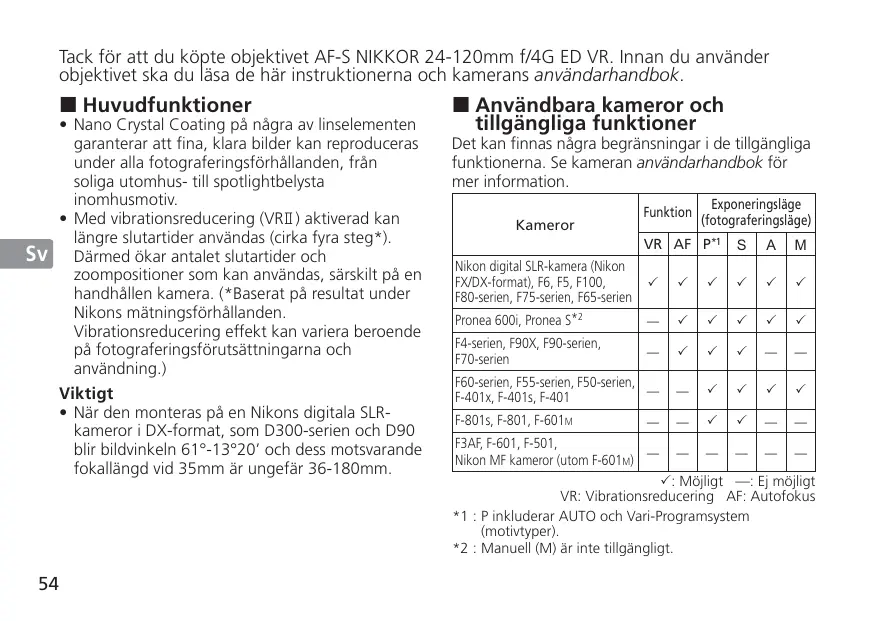 Jp Tack för att du köpte objektivet AF-S NIKKOR 24-120mm f/4G ED VR. Innan du använder objektivet ska du läsa de här instruktionerna och kamerans användarhandbok.