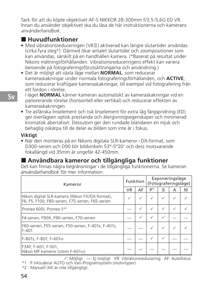 Tack för att du köpte objektivet AF-S NIKKOR 28-300mm f/3,5-5,6G ED VR. Innan du använder objektivet ska du läsa de här instruktionerna och kamerans användarhandbok.