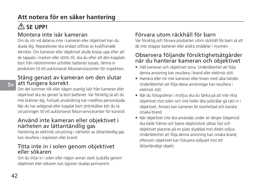 Om detkommen rök erller nàgon ovenlig lukt是从 kameran erler objektivet sku da genast ta bort batteriet. Var försiktig às att du inte bränner dig.Fortsatt använding kan medföra personskada. Nár du har avlçsnat erller koppat bort stromkällan bor du t urustningen till ett auktoriserat Nikon-servicecenter for kontroll.