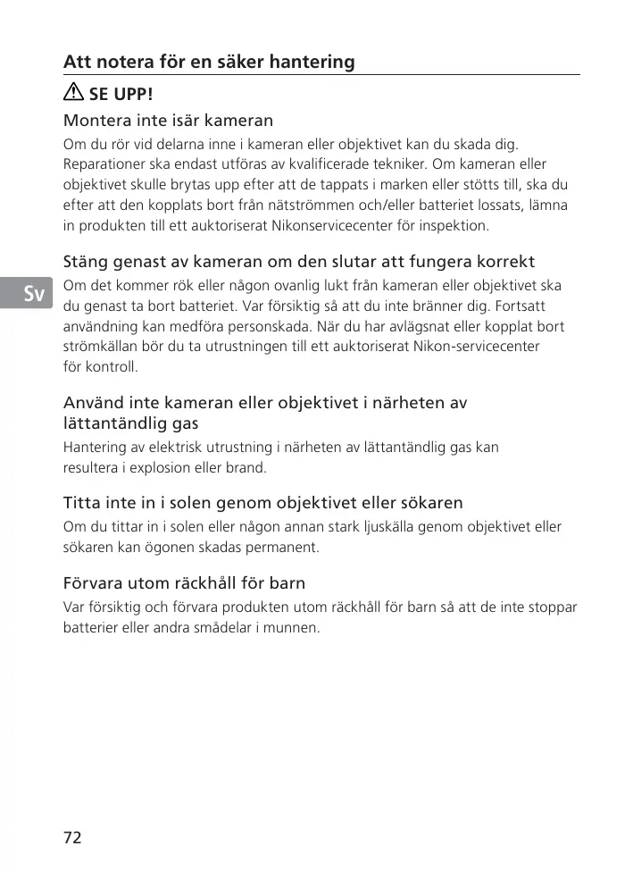• Håll kameran och objektivet torra. Underlåtenhet att följa denna anvisning kan resultera i brand eller elektrisk stöt.