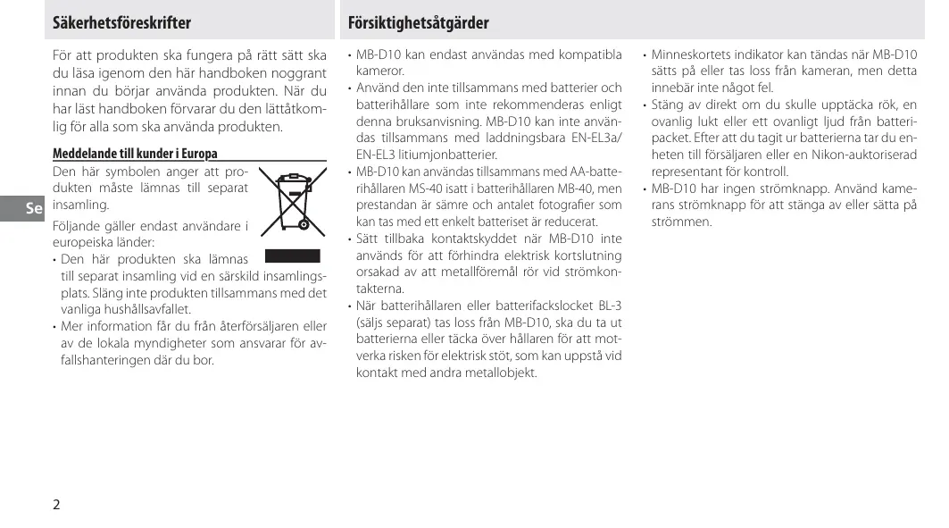 BRUKSANVISNING MB-D10 MULTI-POWER BATTERY PACK NIKON