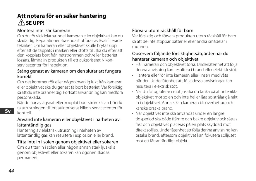 Stäng genast av kameran om den slutar att fungera korrekt Om det kommer rök eller någon ovanlig lukt från kameran eller objektivet ska du genast ta bort batteriet. Var försiktig så att du inte bränner dig. Fortsatt användning kan medföra personskada. När du har avlägsnat eller kopplat bort strömkällan bör du ta utrustningen till ett auktoriserat Nikon-servicecenter för kontroll.