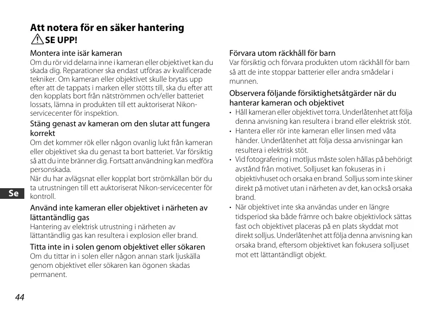 Om du rôr vid delamainne ikameran eller objektivet kan du skada dig, Reparationer ska endast utfôras av kvalificerade tekniker. Om kameran eller objektivet skulle brytas upp efter att de tappats i marken eller stôtts til, ska du efter att den kopplats bort frän nätsträmmen och/eller batreriet lossats, lamna in produkten till ett auktoriserat Nikon- servicecenter fôr inspektion.