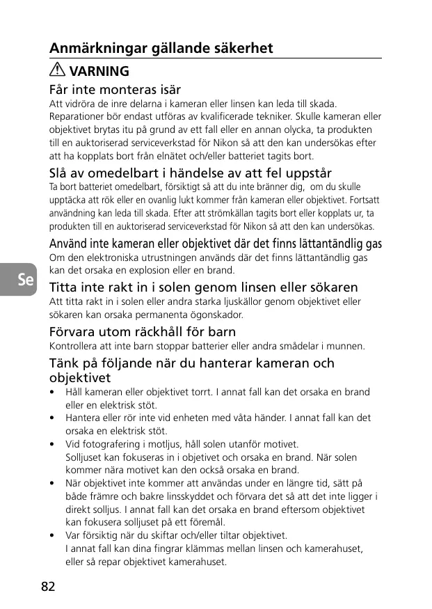 Éteignez immédiatement en cas de dysfonctionnement Si de la fumée ou une odeur inhabituelle se dégage de l'appareil photo ou de l'objectif, retirez immédiatement l'accumulateur ou les piles en prenant soin de ne pas vous brûler. Toute continuation prolongée de l'appareil peut provoquer des blessures. Après avoir retiré ou débranché la source d'alimentation, confiez votre matériel pour inspection à un centre de service agréé Nikon.