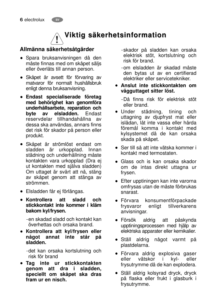 V iktig säk er he tsinf or mation Allmänna säkerhetsåtgärder Spara bruksanvisningen då den måste finnas med om skåpet säljs eller överlåts till annan person. Skåpet är avsett för förvaring av matvaror för normalt hushållsbruk enligt denna bruksanvisning. Endast specialiserade företag med behörighet kan genomföra underhållsarbete, reparation och byte av elsladden. Endast reservdelar tillhandahållna av dessa ska användas, annars finns det risk för skador på person eller produkt. Skåpet är strömlöst endast om sladden är urkopplad. Innan städning och underhållning måste kontakten vara urkopplad (Dra ej ut kontakten med själva sladden) Om uttaget är svårt att nå, stäng av skåpet genom att stänga av strömmen. -skador på sladden kan orsaka elektrisk stöt, kortslutning och risk för brand. -om elsladden är skadad måste den bytas ut av en certifierad elektriker eller servicetekniker. Anslut inte stickkontakten om vägguttaget sitter löst. -Då finns risk för elektrisk stöt eller brand. Under städning, tining och uttagning av djupfryst mat eller islådan, låt inte vassa eller hårda föremål komma i kontakt med kylsystemet då de kan orsaka skada på skåpet. Ser till så att inte vätska kommer i kontakt med termostaten. Glass och is kan orsaka skador om de intas direkt uttagna ur frysen. Elsladden får ej förlängas. Efter upptiningen kan inte varorna omfrysas utan de måste förbrukas snarast. Kontrollera att sladd och stickkontakt inte kommer i kläm bakom kyl/frysen. Förvara konsumentförpackade frysvaror enligt tillverkarens anvisningar. -en skadad sladd och kontakt kan överhettas och orsaka brand. Kontrollera att kyl/frysen eller något annat inte står på sladden. Försök aldrig att påskynda upptiningsprocessen med hjälp av elektriska apparater eller kemikalier. -det kan orsaka kortslutning och risk för brand Tag inte ur stickkontakten genom att dra i sladden, speciellt om skåpet ska dras fram ur en nisch. Ställ aldrig något plastdelarna. varmt
