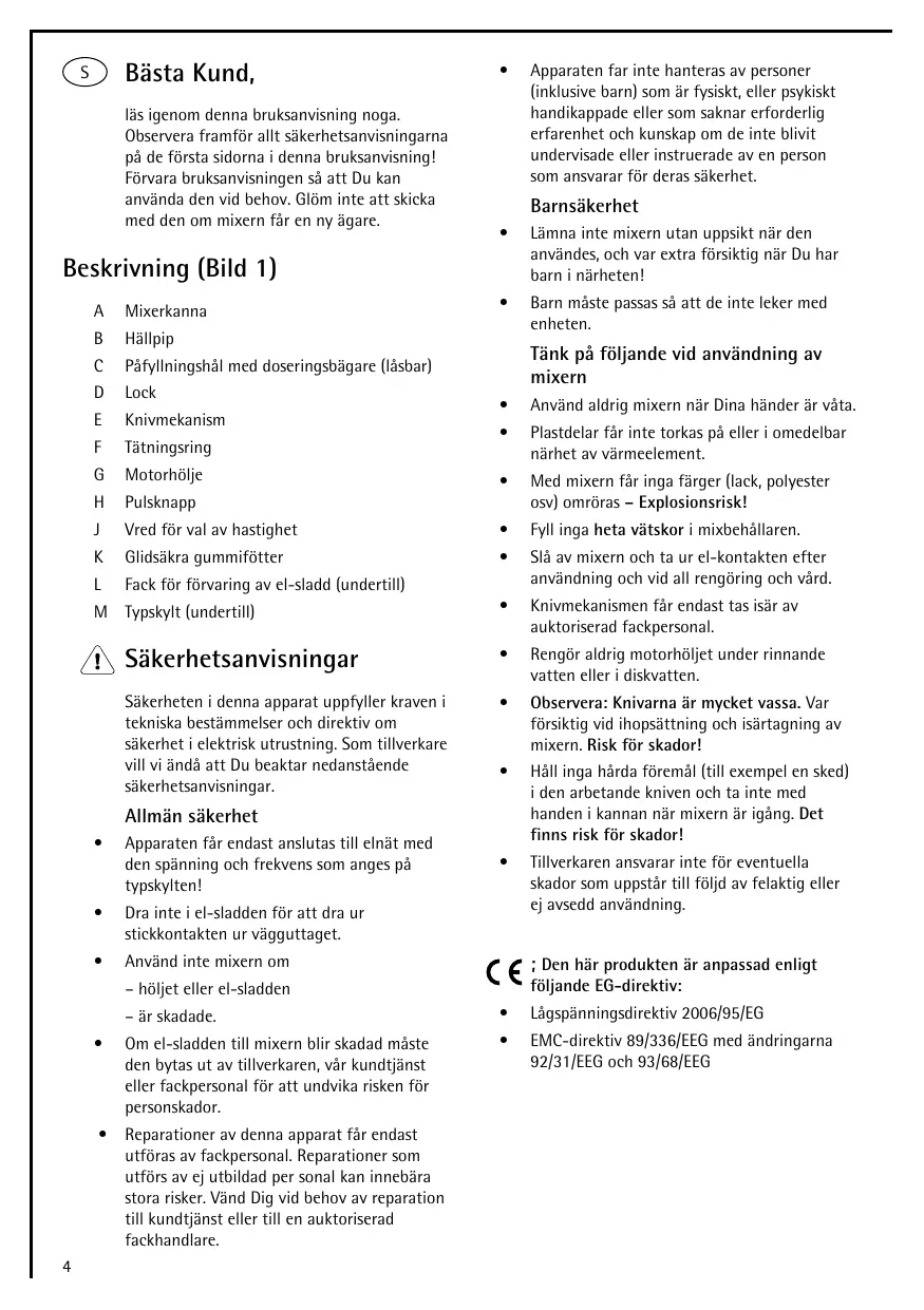 äs ige nom de nna bruk sanvisning noga. O bse rve ra fram för al t säk e rh e tsanvisningarna påde första sidorna i de nna bruk sanvisning! Förvara bruk sanvisninge n såatt D u k an använda de n vid be h ov. Gl öm inte att sk ick a m e d de n om m ixe rn får e n ny ägare . Be sk rivning (Bil d 1) Barnsäk e rh e t