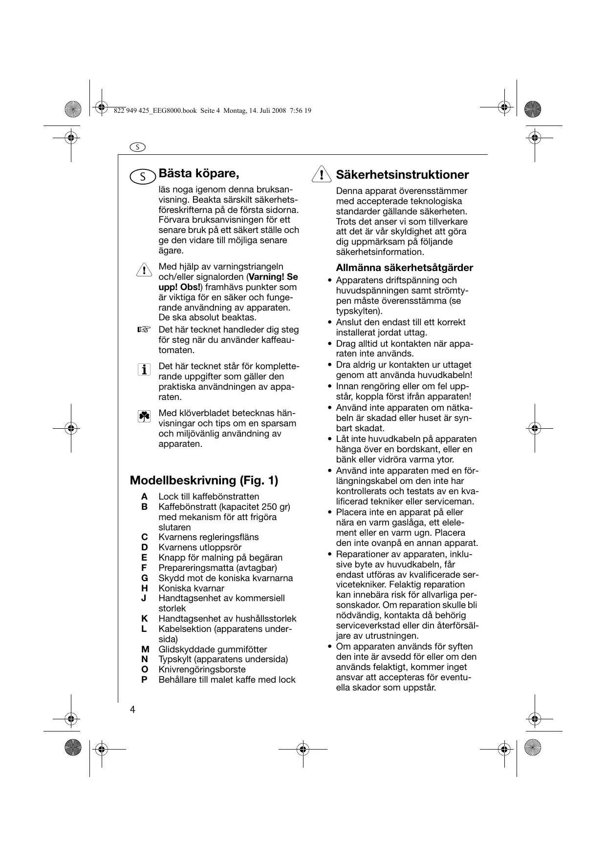 Med hjälp av varningsstriangeln och/eller signalorden (Varning! Se upp! Obs!) framhävs punkter som ar viktiga for en saker och fungerande användning av apparaten. De sca absolut beaktas.