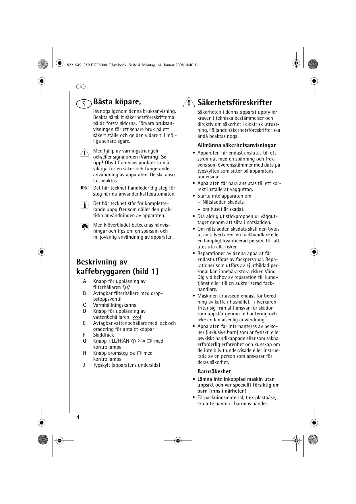 s Bästa köpare, 1 Säkerhetsföreskrifter läs noga igenom denna bruksanvisning. Beakta särskilt säkerhetsföreskrifterna på de första sidorna. Förvara bruksanvisningen för ett senare bruk på ett säkert ställe och ge den vidare till möjliga senare ägare. Säkerheten i denna apparat uppfyller kraven i tekniska bestämmelser och direktiv om säkerhet i elektrisk utrustning. Följande säkerhetsföreskrifter ska ändå beaktas noga. Med hjälp av varningstriangeln och/eller signalorden (Varning! Se upp! Obs!) framhävs punkter som är viktiga för en säker och fungerande användning av apparaten. De ska absolut beaktas. 0 Det här tecknet handleder dig steg för steg när du använder kaffeautomaten.