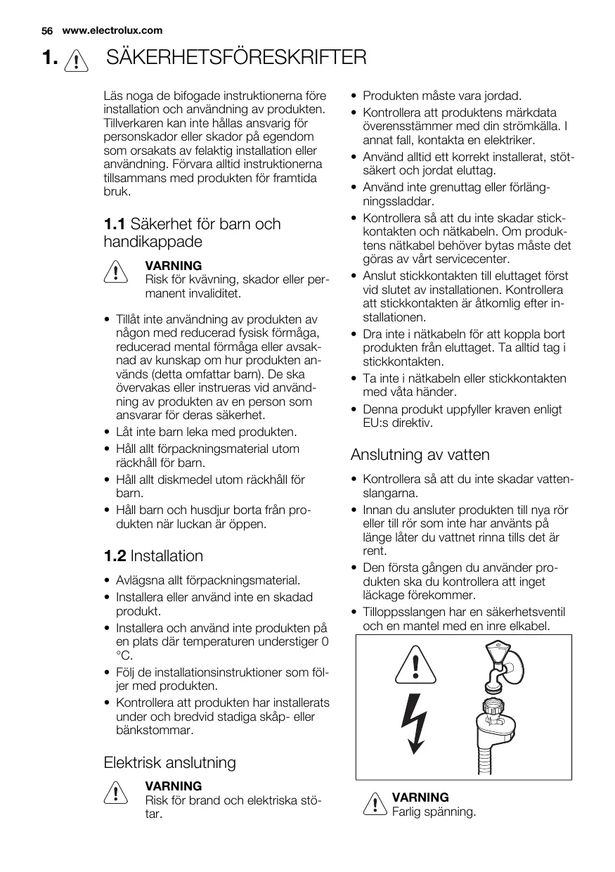 Avlägsna alt férpackningsmaterial. Installera eller använd inte en skadad produkt. Installera och använd inte produkten pà en plats där temperaturen understiger O °C. Fôlj de installationsinstruktioner som fôl- jer med produkten. Kontrollera att produkten har installerats under och bredvid stadiga skäp- eller bänkstommar. Elektrisk anslutning VARNING Risk fôr brand och elektriska stô- tar. Produkten mäste vara jordad. Kontrollera att produktens märkdata ôverensstämmer med din strômkälla. 1 annat fall, kontakta en elektriker. Använd alltid ett korrekt installerat, stôt- säkert och jordat eluttag. Använd inte grenuttag eller férläng- ningssladdar. Kontrollera sà att du inte skadar stick- kontakten och nätkabeln. Om produk- tens nätkabel behôver bytas mâste det gôras av värt servicecenter. Anslut stic«kontakten till eluttaget fôrst vid slutet av installationen. Kontrollera att stickkontakten är ätkomlig efter in- stallationen. Dra inte i nätkabeln fôr att koppla bort produkten frän eluttaget. Ta alltid tag i stickkontakten. Ta inte i nätkabeln eller stickkontakten med väta händer. Denna produkt uppfyller kraven enligt EU:s direktiv. Anslutning av vatten + Kontrollera sà att du inte skadar vatten- slangama. + Innan du ansluter produkten till nya rôr eller till rôr som inte har använts pà länge lâter du vattnet rinna tills det är rent. + Den fürsta gängen du använder pro- dukten ska du kontrollera att inget läckage fôrekommer. + Tilloppsslangen har en säkerhetsventil och en mantel med en inre elkabel. VARNING Farig spänning.