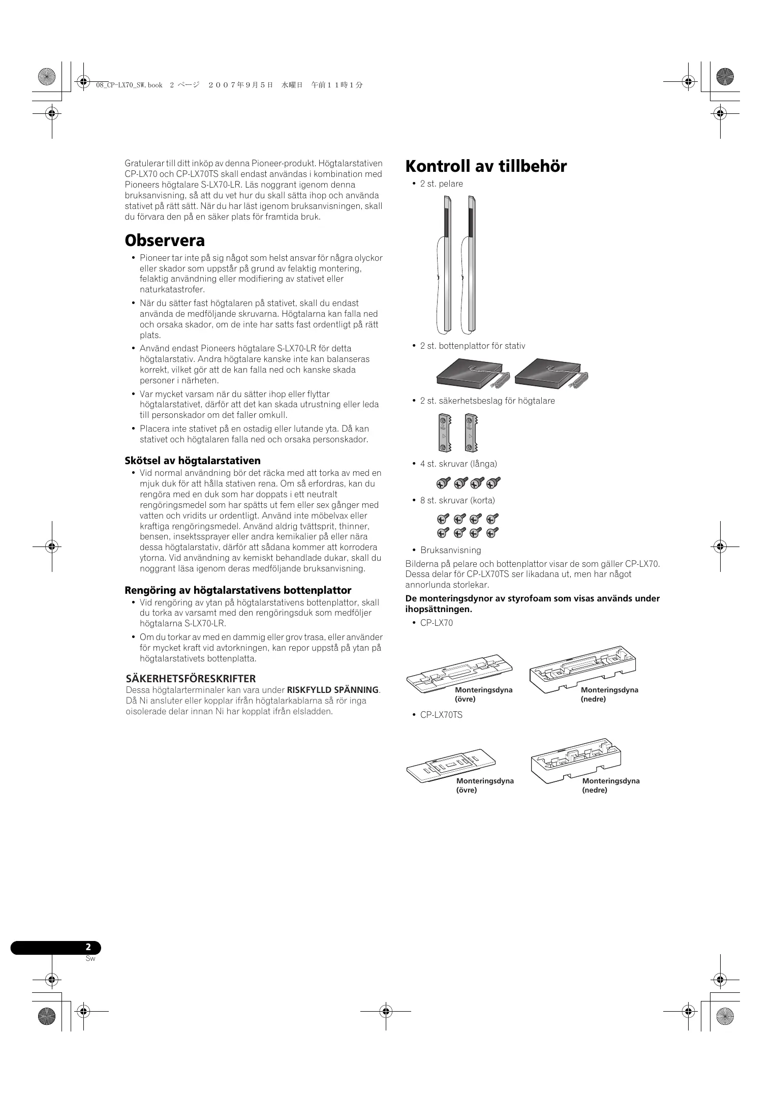 © | & DB-UP-LXTO_SH. book 2 <—2 2007#Æ9A5H MA FSI 112 Gratulerartill ditt inkëp av denna Pioneer-produkt, Hôgtalarstativen CP-LX70 och CP-LXTOTS skall endast användas i kombination med Pioneers hôgtalare S-LXT0-LR. Läs noggrant igenom denna bruksanvisning, sä att du vet hur du skall sätta ihop och använda stativet pâ rätt sätt. När du har läst igenom bruksanvisningen, skall du fôrvara den pâ en säker plats fôr framtida bruk. Observera + Pioneertar inte pâ sig nägot som helst ansvar fôr nâgra olyckor eller skador som uppstär pä grund av felaktig montering felaktig användning eller modifiering av stativet eller naturkatastrofer. Nër du sätter fast hôgtalaren pâ stativet, skall du endast använda de medfôljande skruvarna. Hôgtalarna kan falla ned och orsaka skador, om de inte har satts fast ordentligt pä rätt plats. Använd endast Pioneers hôgtalare S-LX70-LR fr detta hôgtalarstativ. Andra hôgtalare kanske inte kan balanseras korrekt, vilket gôr att de kan falla ned och kanske skada personer i närheten! Var mycket varsam när du sätter ihop eller flyttar hôgtalarstativet, därfôr att det kan skada utrustning eller leda till personskador om det faller omkull Placera inte stativet pâ en ostadig eller lutande ÿta. DA kan stativet och hôgtalaren falla ned och orsaka personskador. Skôtsel av hôgtalarstativen + Vid normal användning bôr det räcka med att torka av med en mjuk duk fôr att hälla stativen rena. Om sà erfordras, kan du rengôra med en duk som har doppats i ett neutralt rengôringsmedel som har spätts ut fem eller sex gänger med vatten och vridits ur ordentligt. Använd inte môbelvax eller kraftiga rengôringsmedel. Använd aldrig tvättsprit, thinner, bensen, insektssprayer eller andra kemikalier pä eller nära dessa hôgtalarstativ, därfôr att sâdana kommer att korrodera ytorna. Vid användning av kemiskt behandiade dukar, skall du noggrant läsa igenom deras medfôljande bruksanvisning. Rengôring av hôgtalarstativens bottenplattor + Vid rengôring av ytan pä hôgtalarstativens bottenplattor, skall du torka av varsamt med den rengôringsduk som medfôljer hôgtalarna S-LX7O-LR. + Om du torkar av med en dammig eller grovtrasa, eller använder fôr mycket kraft vid avtorkningen, kan repor uppstà pâ ytan pà hôgtalarstativets bottenplatta. SAKERHETSFORESKRIFTER Dessa hôgtalarterminaler kan vara under RISKFYLLD SPÂNNING Dä Ni ansluter eller kopplar ifrân hôgtalarkablarna sà rôr inga oisolerade delar innan Ni har kopplat ifrän elsladden. Kontroll av tillbehôr + 2 st. pelare