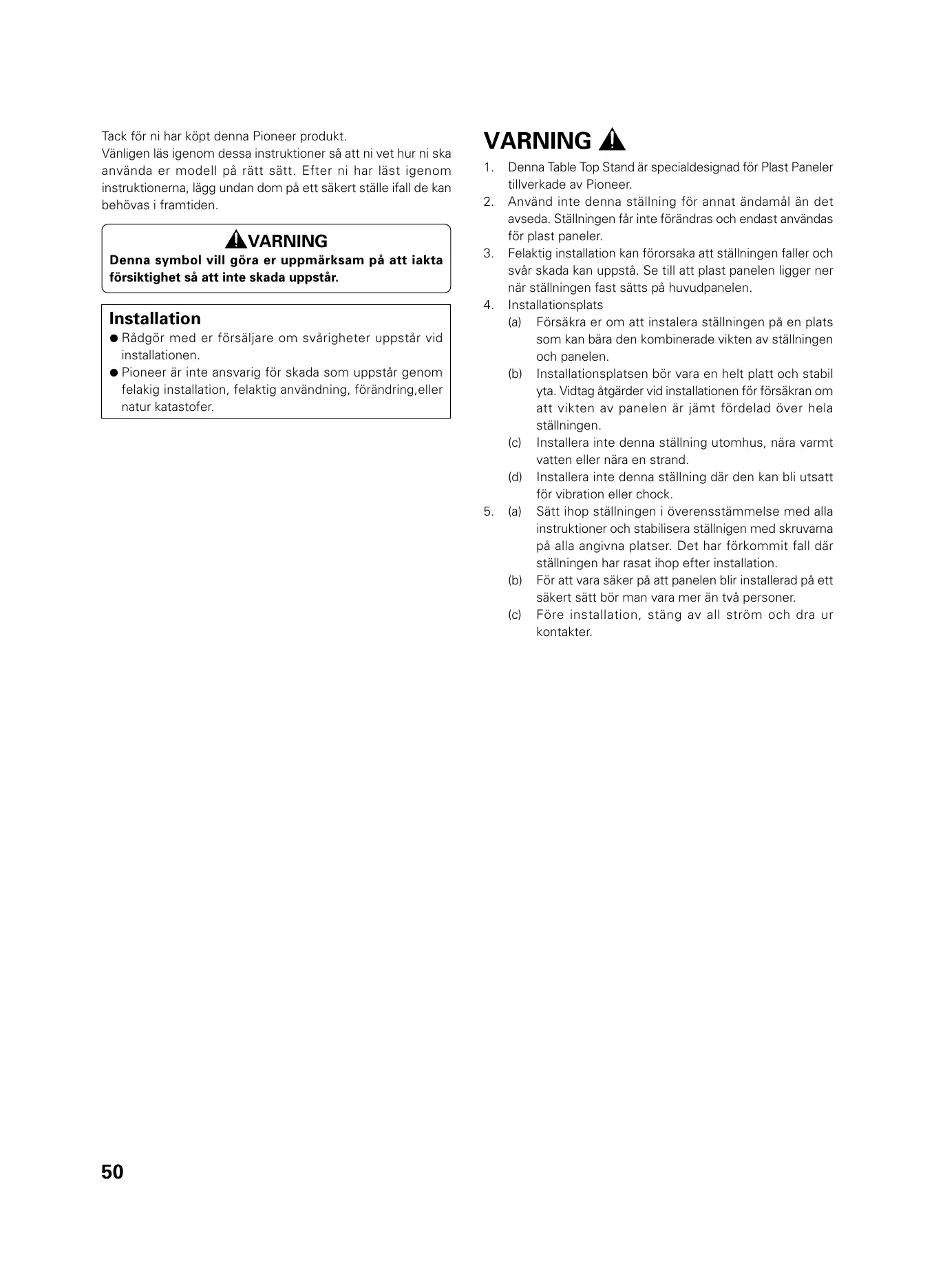 Denna Table Top Stand är specialdesignad för Plast Paneler tillverkade av Pioneer. Använd inte denna ställning för annat ändamål än det avseda. Ställningen får inte förändras och endast användas för plast paneler. Felaktig installation kan förorsaka att ställningen faller och svår skada kan uppstå. Se till att plast panelen ligger ner när ställningen fast sätts på huvudpanelen. Installationsplats (a) Försäkra er om att instalera ställningen på en plats som kan bära den kombinerade vikten av ställningen och panelen. (b) Installationsplatsen bör vara en helt platt och stabil yta. Vidtag åtgärder vid installationen för försäkran om att vikten av panelen är jämt fördelad över hela ställningen. (c) Installera inte denna ställning utomhus, nära varmt vatten eller nära en strand. (d) Installera inte denna ställning där den kan bli utsatt för vibration eller chock. (a) Sätt ihop ställningen i överensstämmelse med alla instruktioner och stabilisera ställnigen med skruvarna på alla angivna platser. Det har förkommit fall där ställningen har rasat ihop efter installation. (b) För att vara säker på att panelen blir installerad på ett säkert sätt bör man vara mer än två personer. (c) Före installation, stäng av all ström och dra ur kontakter.