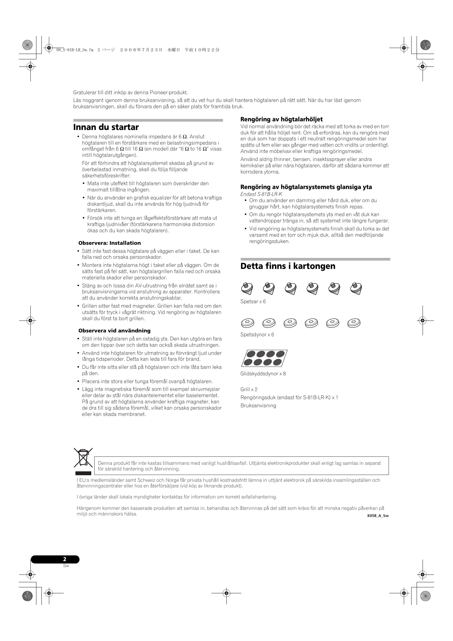 Gratulerar till ditt inköp av denna Pioneer-produkt. Läs noggrant igenom denna bruksanvisning, så att du vet hur du skall hantera högtalaren på rätt sätt. När du har läst igenom bruksanvisningen, skall du förvara den på en säker plats för framtida bruk.