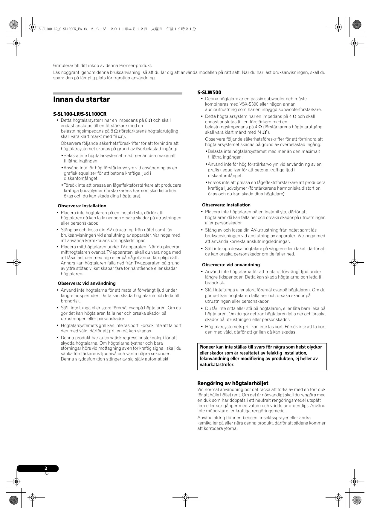 Pioneer kan inte ställas till svars fôr nâgra som helst olyckor eller skador som är resultatet av felaktig installation, felanvändning eller modifiering av produkten, ej heller av naturkatastrofer.
