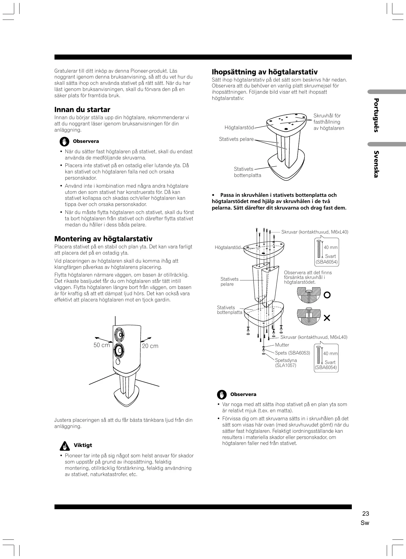 Innan du bôrjar ställa upp din hôgtalare, rekommenderar vi att du noggrant läser igenom bruksanvisningen fôr din anläggning.
