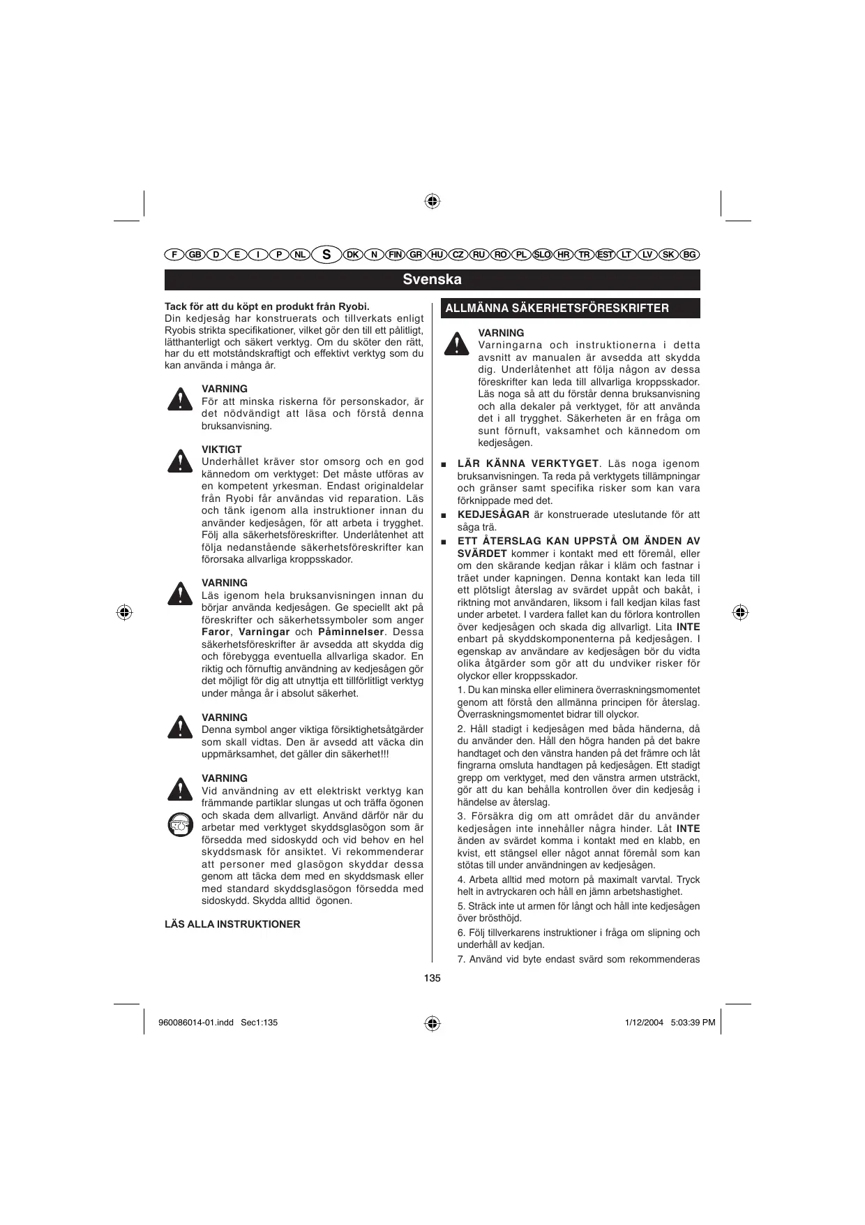 VARNING Varningarna och instruktionerna i detta avsnitt av manualen är avsedda att skydda dig. Underlåtenhet att följa någon av dessa föreskrifter kan leda till allvarliga kroppsskador. Läs noga så att du förstår denna bruksanvisning och alla dekaler på verktyget, för att använda det i all trygghet. Säkerheten är en fråga om sunt förnuft, vaksamhet och kännedom om kedjesågen. VARNING För att minska riskerna för personskador, är det nödvändigt att läsa och förstå denna bruksanvisning. VIKTIGT Underhållet kräver stor omsorg och en god kännedom om verktyget: Det måste utföras av en kompetent yrkesman. Endast originaldelar från Ryobi får användas vid reparation. Läs och tänk igenom alla instruktioner innan du använder kedjesågen, för att arbeta i trygghet. Följ alla säkerhetsföreskrifter. Underlåtenhet att följa nedanstående säkerhetsföreskrifter kan förorsaka allvarliga kroppsskador.