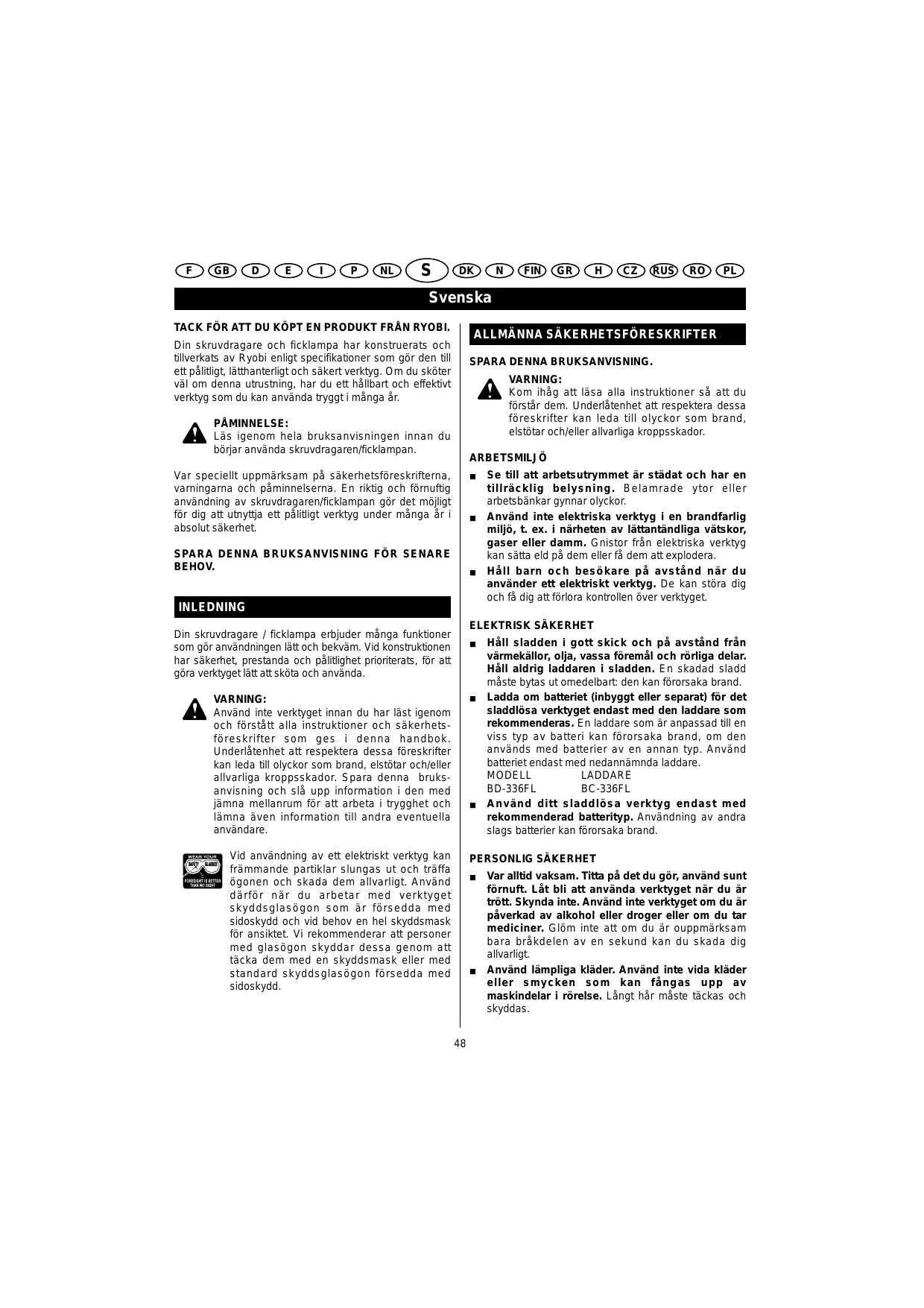 BRUKSANVISNING BD-336FL RYOBI