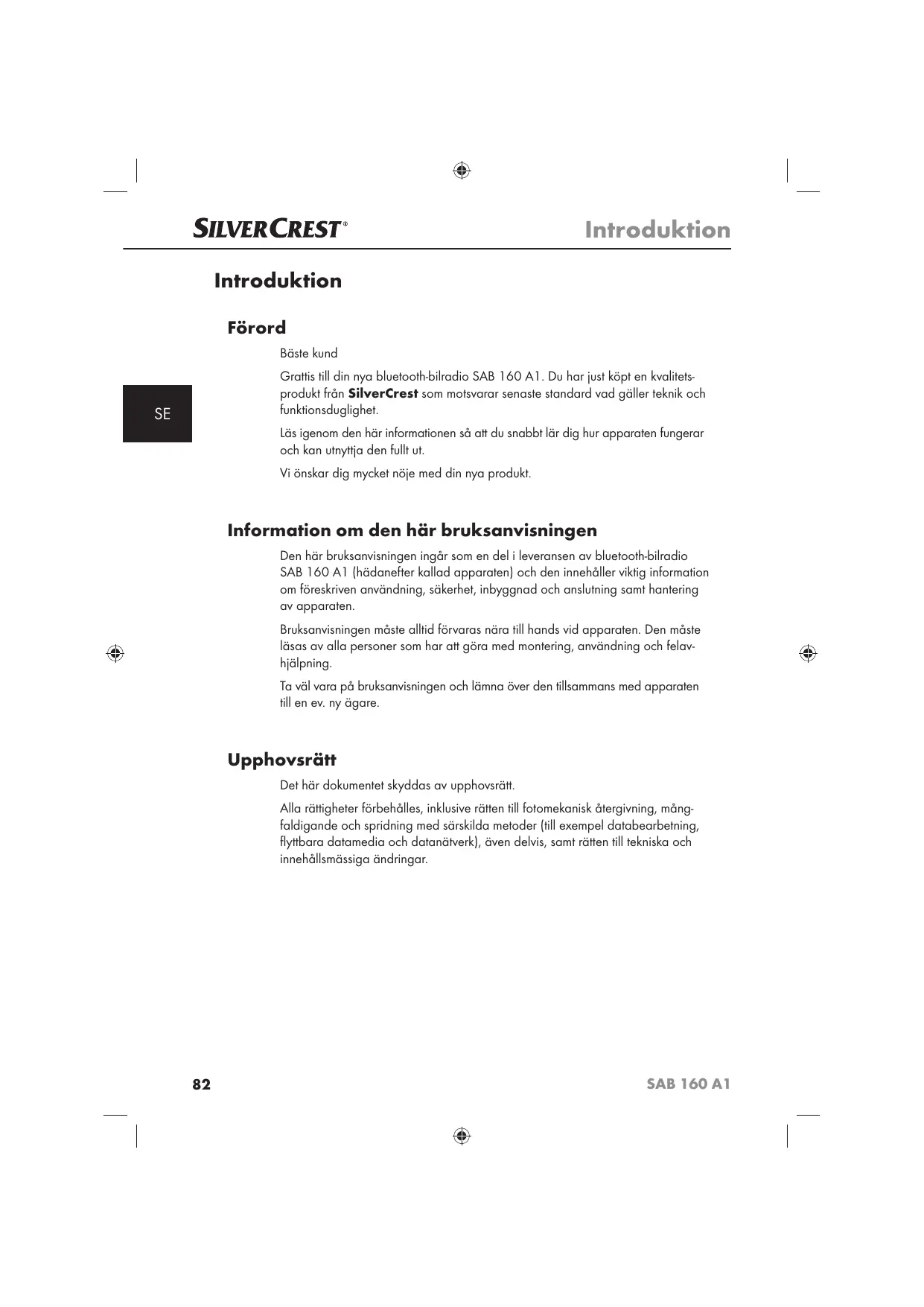Introduktion Fôrord Bäste kund Grattis til din nya bluetoothbilradio SAB 160 A1. Du har just kôpt en kvalitets- produkt frän SilverCrest som motsvarar senaste standard vad géller teknik och funktionsduglighet. Läs igenom den här informationen sä ait du snabbt lr dig hur apparaten fungerar och kan utnyttja den fullt ut. Vi ônskar dig mycket nôje med din nya produkt Information om den här bruksanvisningen Den hr bruksanvisningen ingär som en del i leveransen av bluetooth-bilradio SAB 160 A1 {hädanefter kallad apparaten] och den innehäller viktig information om fôreskriven användning, säkerhet, inbyggnad och anslutning samt hantering av apparaten. Bruksanvisningen mäste alltid fôrvaras nära till hands vid apparaten. Den mäste läsas av alla personer som har att gôra med montering, användning och felav- hjélpning. Ta väl vara pà bruksanvisningen och lémna êver den fllsammans med apparaten till en ev. ny ägare. Upphovsrätt Det här dokumentet skyddas av upphovsrätt Alla rêttigheter férbehälles, inklusive räten til fotomekanisk étergivning, mäng- faldigande och spridning med särskilda metoder [ill exempel databearbetning, flybara datamedia och datanäverk], ëven delvis, samt rëtten til tekniska och innehällsmässiga ändringar. SAB 160 A1