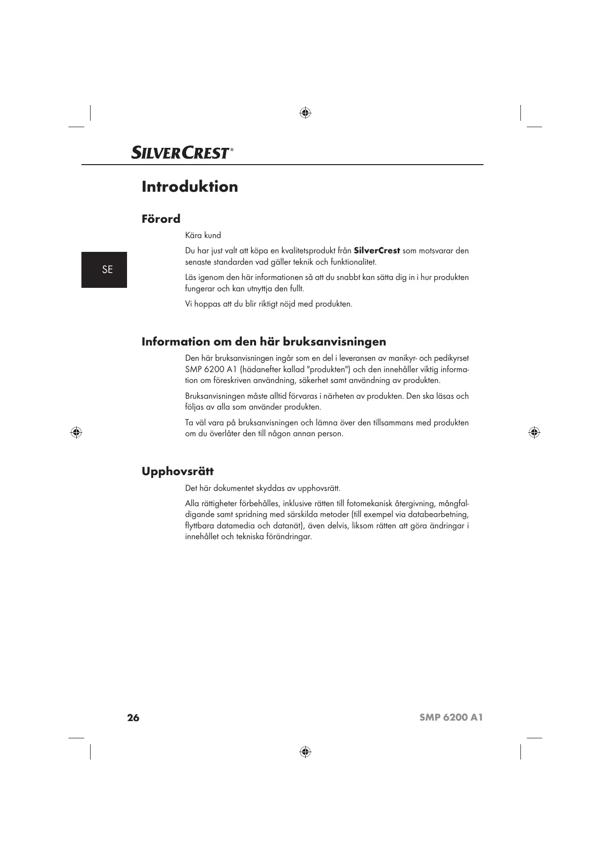 Den hër bruksanvisningen ingër som en del i leveransen av manikyr: och pedikyrset SMP 6200 A1 (hädanefter kallad produkten'} och den innehäller viktig informa- tion om féreskriven användning, sëkerhet samt användning av produkten.