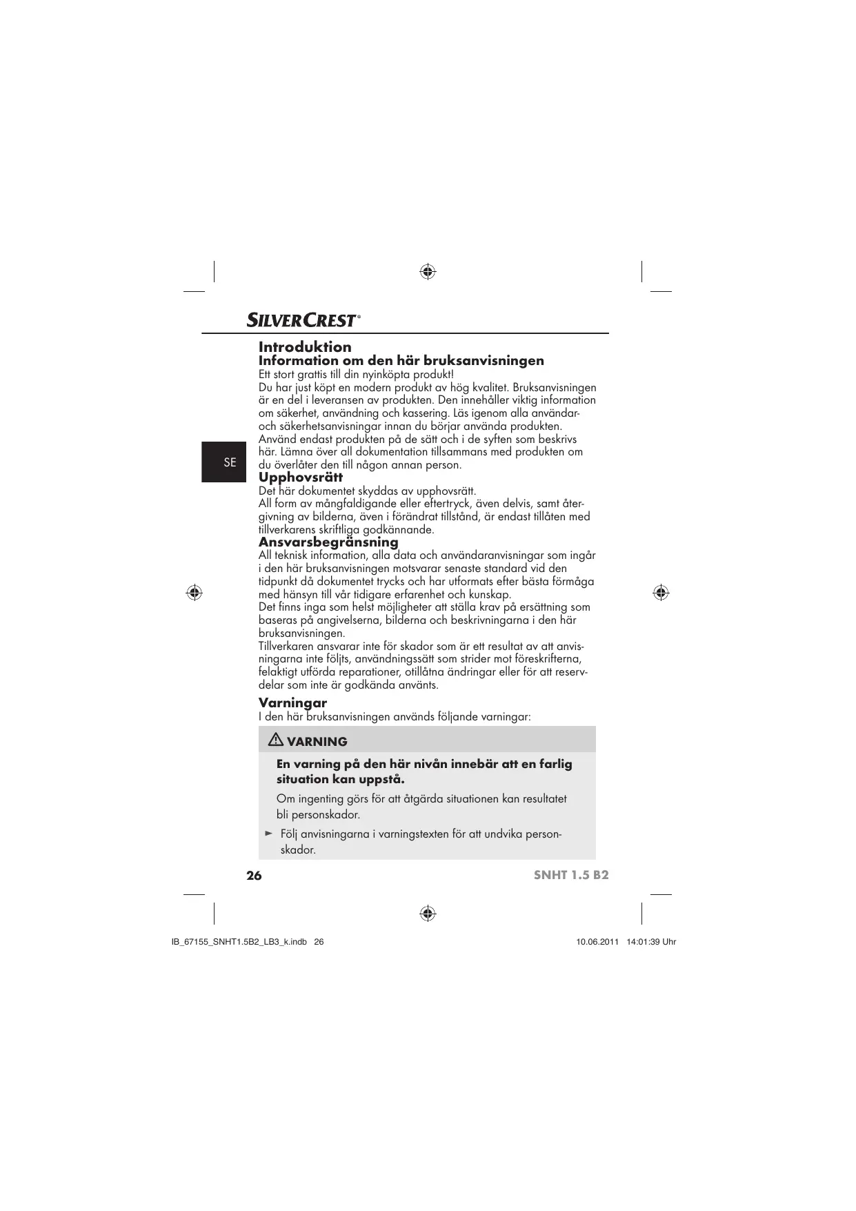 SILVERCREST‘ Introduktion Information om den här bruksanvisningen Ett stort grattis till din nyinkôpta produkt! Du har just kpt en modem produkt av hôg kvalitet. Bruksanvisningen är en del i leveransen av produkten. Den innehäller viktig information om säkerhet, användning och kassering. Läs igenom alla användar- och säkerhetsanvisningar innan du bôrjar använda produkten Använd endast produkten pà de sätt och i de syften som beskrivs här. Lämna ôver all dokumentation tillsammans med produkten om du ôverläter den till nägon annan person Upphovsrätt Det här dokumentet skyddas av upphovsrätt All form av méngfaldigande eller eftertryck, även delvis, samt äter- givning av bilderna, även i férändrat tillständ, är endast tilläten med tillverkarens skriftliga godkännande. Ansvarsbegränsning All teknisk information, alla data och användaranvisningar som ingär i den här bruksanvisningen motsvarar senaste standard vid den tidpunkt dä dokumentet trycks och har utformats efter bästa fôrmäga med hänsyn till vär tidigare erfarenhet och kunskap. & Det finns inga som helst môiligheter att ställa krav pä ersätining som baseras pà angivelsema, bilderna och beskrivningarna i den här bruksanvisningen. Tillverkaren ansvarar inte fôr skador som är ett resultat av att anvis- ningarna inte fôlits, användningssätt som strider mot fôreskrifterna, felaktigt vtférda reparationer, otillätna ändringar eller fôr att reserv- delar som inte är godkända använts. Varningar 1 den här bruksanvisningen används féljande varningar: À VARNING En varning pà den här nivän innebär att en farlig situation kan uppstä. Om ingenting gôrs fôr att ätgärda situationen kan resultatet bli personskador. > Fôlj anvisningarna i varningstexten fr att undvika person- skador. 26 SNHT 1.5 B2 1B_67155_SNHT1.582 LB3 kindb 26 10.06.2011 14:01:39 Uhr
