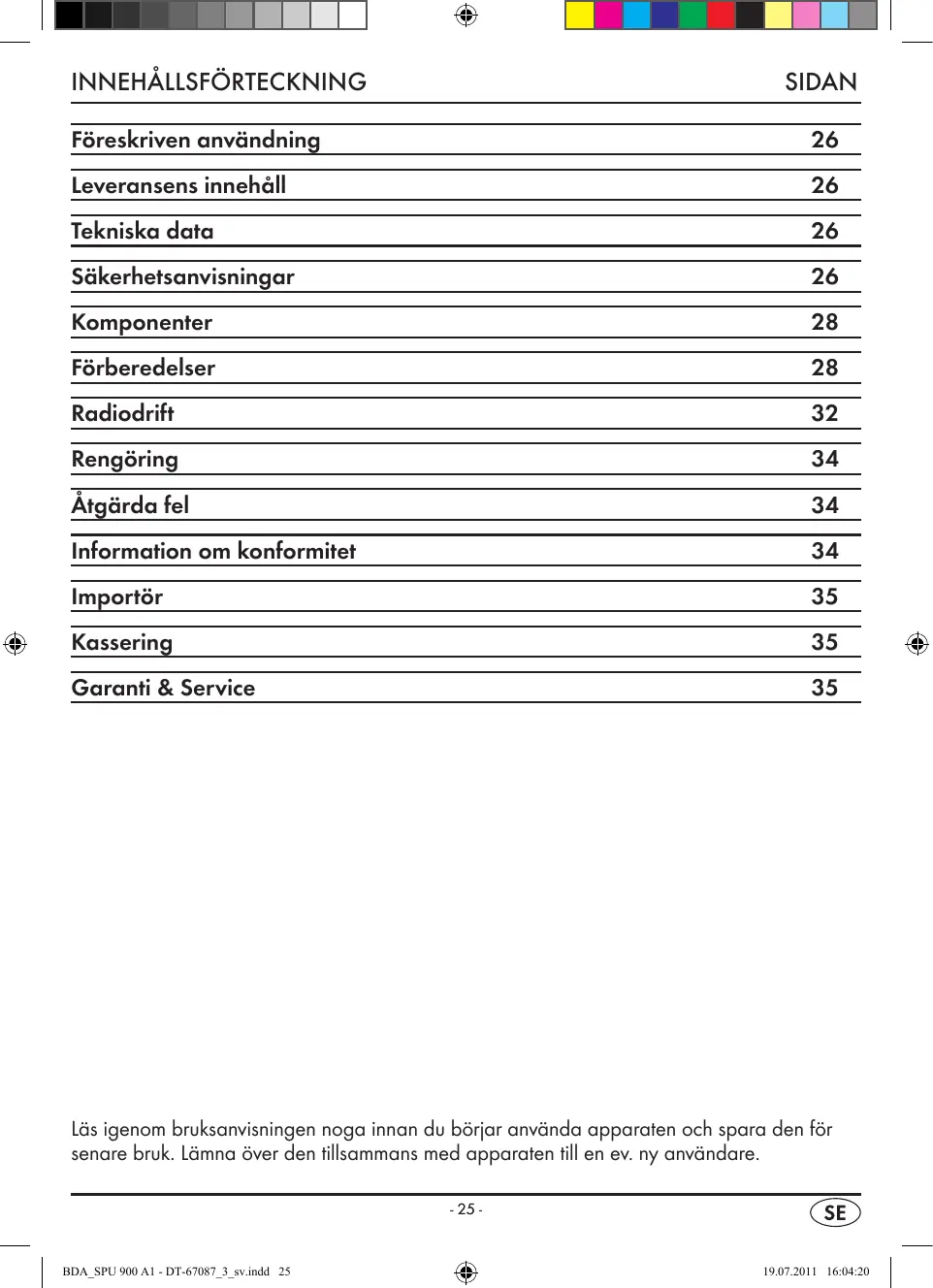 Fôreskriven användning 26 Leveransens innehäll 26 Tekniska data 26 Säkerhetsanvisningar 26 Komponenter 28 Fôrberedelser 28 Radiodrift 32 Rengôring 34 Âtgärda fel 34 Information om konformitet 34 Importôr 35 Kassering 35 Garanti & Service 35 Läs igenom bruksanvisningen noga innan du bërjar använda apparaten och spara den für senare bruk. Lämna ôver den tillsammans med apparaten till en ev. ny användare. BDA_SPU 900 A1 - DT-67087_3_sv.indd 25 -25.