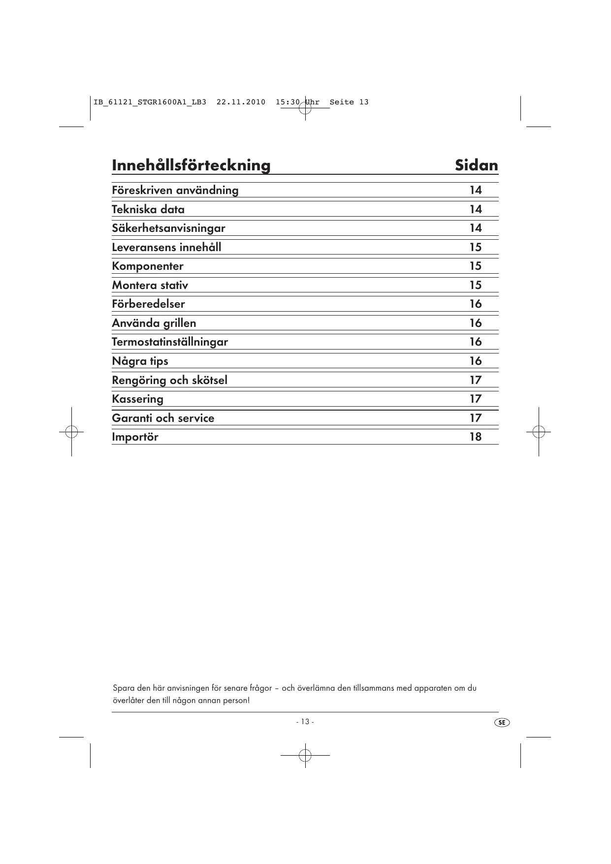 Innehällsfôrteckning Sidan Fôreskriven användning 14 Tekniska data 14 Säkerhetsanvisningar 14 Leveransens innehäll 15 Komponenter 15 Montera stativ 15 Fôrberedelser 16 Använda grillen 16 Termostatinställningar 16 Nägra tips 16 Rengôring och skôtsel 17 Kassering 17 Garanti och service 17 Importôr 18 Spara den här anvisningen fér senare frägor - och éverlämna den tllsammans med apparaten om du êverläter den till nägon annan person! RE G