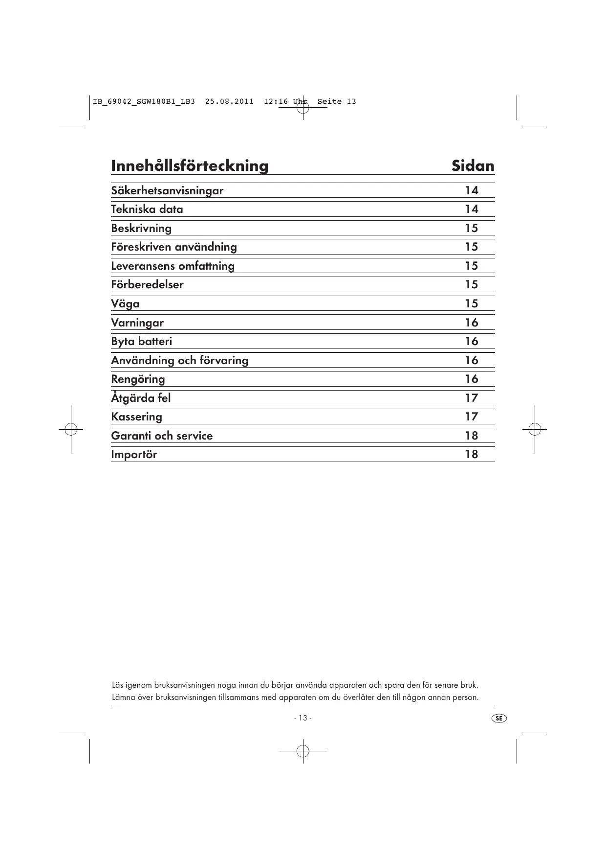 G Innehällsfôrteckning Sidan Säkerhetsanvisningar 14 Tekniska data 14 Beskrivning 15 Fôreskriven användning 15 Leveransens omfatining 15 Fôrberedelser 15 Väga 15 Varningar 16 Byta batteri 16 Användning och fôrvaring 16 Rengôring 16 Atgärda fel 17 À Kassering 17 À | Garanti och service 18 | Importôr 18