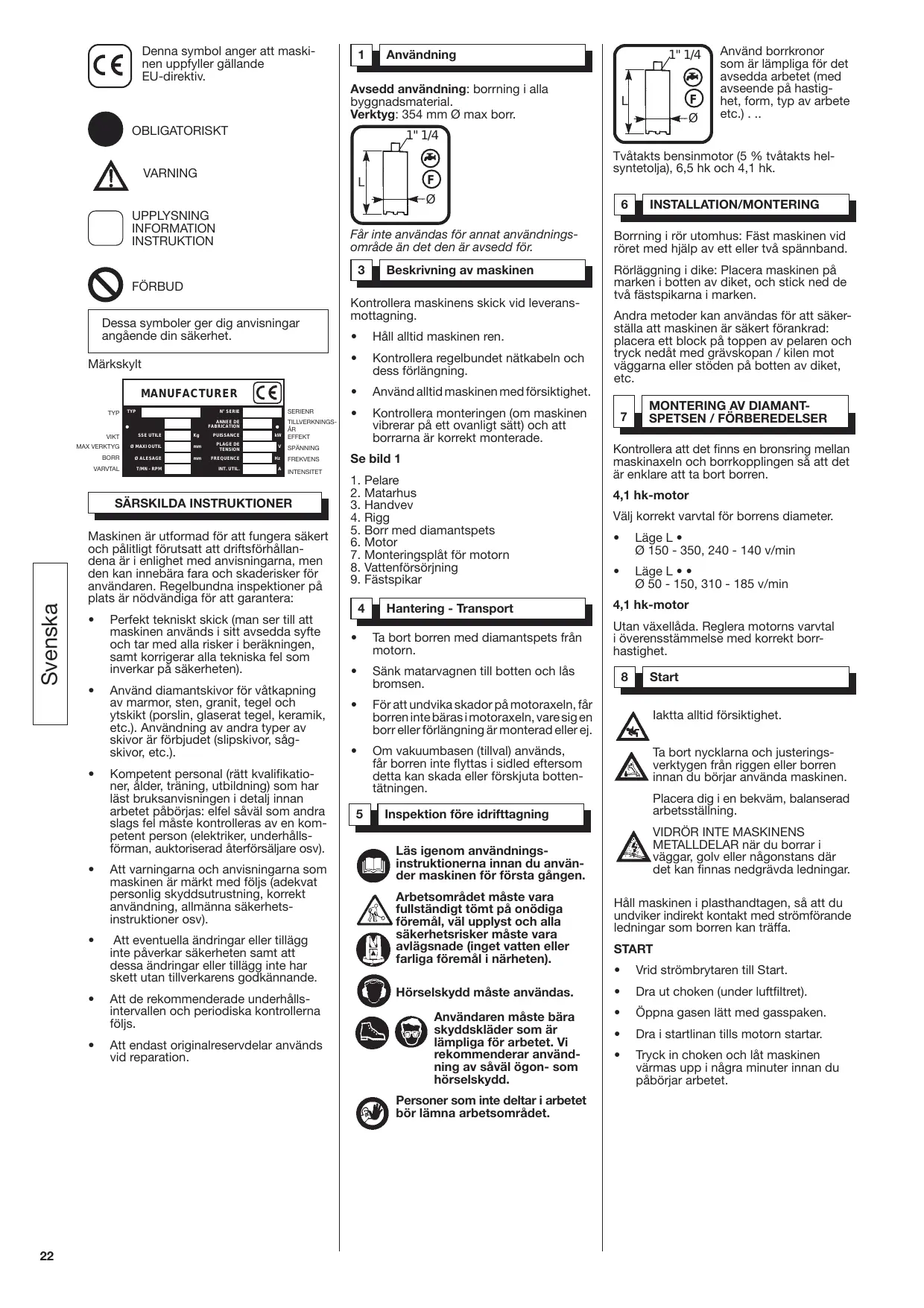 Användning 1" 1/4 Avsedd användning: borrning i alla byggnadsmaterial. Verktyg: 354 mm Ø max borr. OBLIGATORISKT