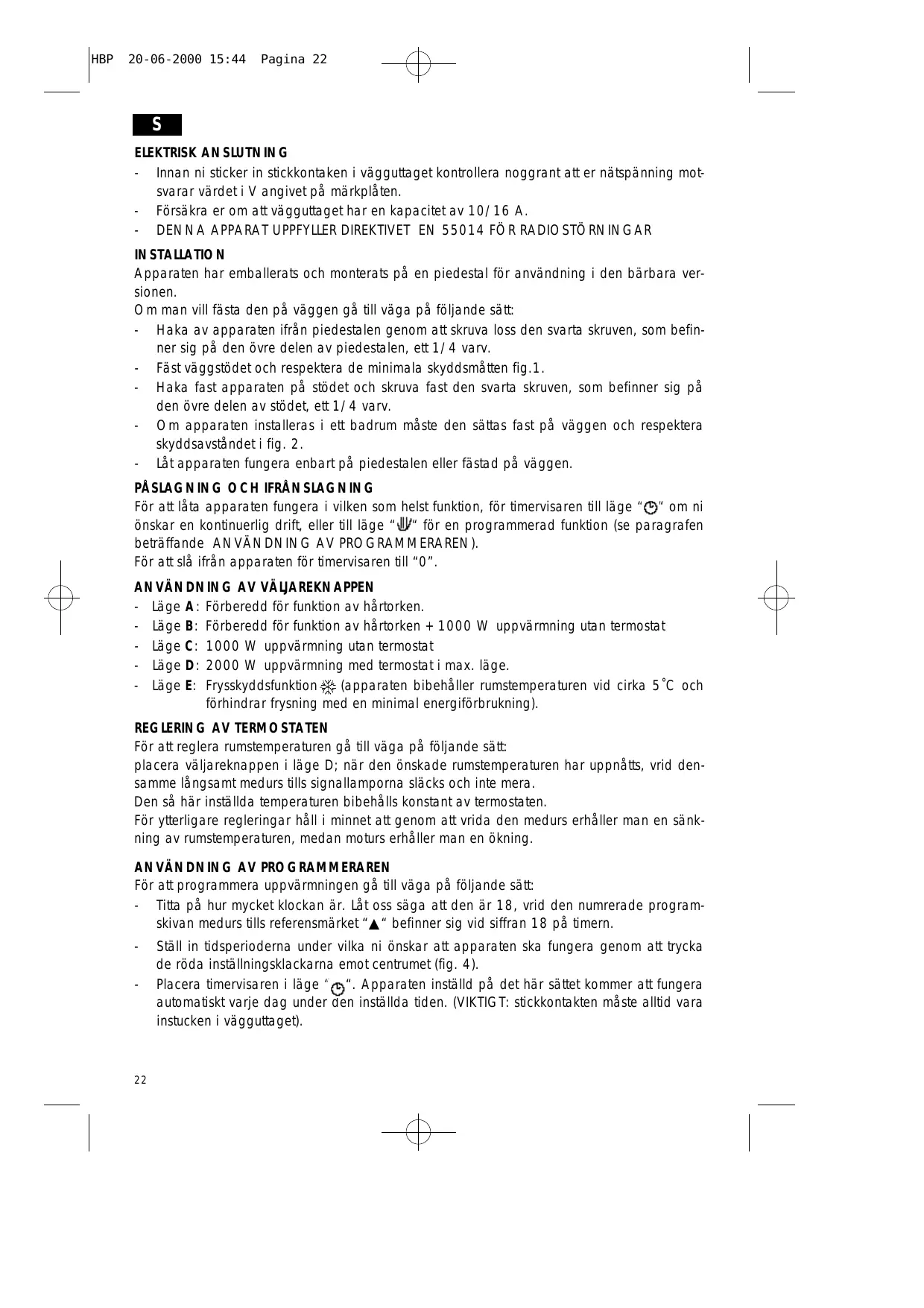 Ställ in tidsperioderna under vilka ni önskar att apparaten ska fungera genom att trycka de röda inställningsklackarna emot centrumet (fig. 4). Placera timervisaren i läge “ “. Apparaten inställd på det här sättet kommer att fungera automatiskt varje dag under den inställda tiden. (VIKTIGT: stickkontakten måste alltid vara instucken i vägguttaget). HBP 20-06-2000 15:44