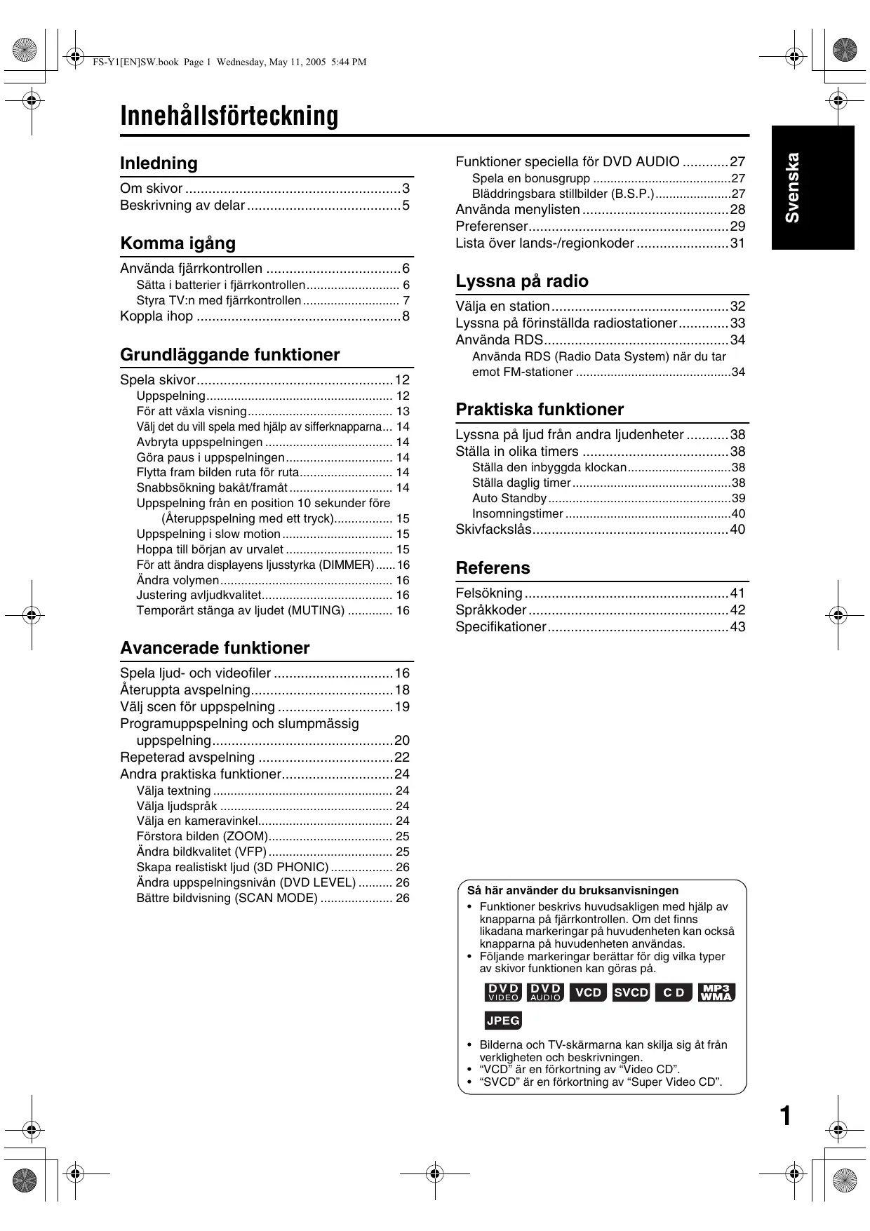 • Le fonctionnement à proprement parler de certains DVD VIDEO, DVD AUDIO, VCD ou SVCD peut différer des explications données dans ce manuel. Ceci est dû à la programmation et à la structure des disques, et non à un mauvais fonctionnement du système.