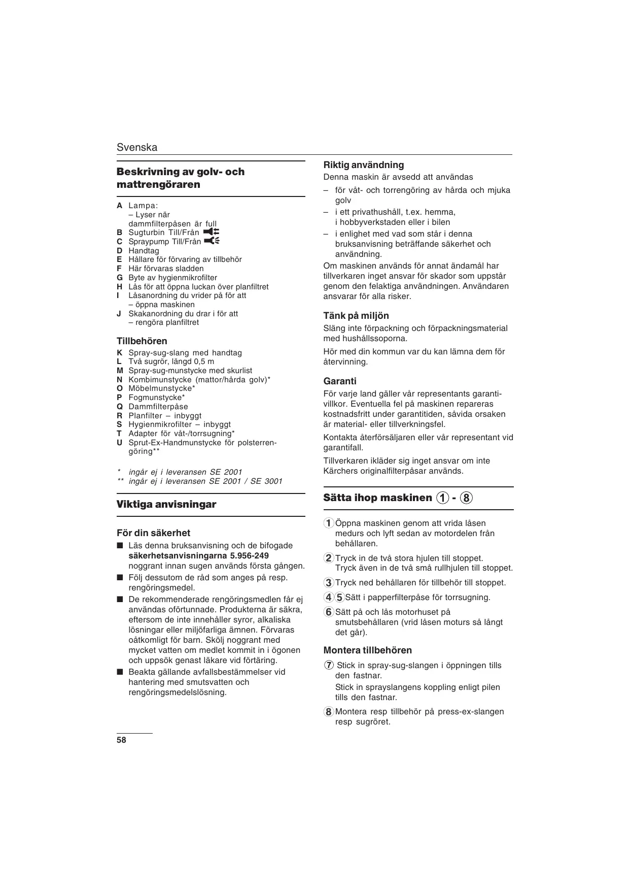 - ingår ej i leveransen SE 2001 ** ingår ej i leveransen SE 2001 / SE 3001 Viktiga anvisningar För din säkerhet ■ Läs denna bruksanvisning och de bifogade säkerhetsanvisningarna 5.956-249 noggrant innan sugen används första gången. ■ Följ dessutom de råd som anges på resp. rengöringsmedel. ■ De rekommenderade rengöringsmedlen får ej användas oförtunnade. Produkterna är säkra, eftersom de inte innehåller syror, alkaliska lösningar eller miljöfarliga ämnen. Förvaras oåtkomligt för barn. Skölj noggrant med mycket vatten om medlet kommit in i ögonen och uppsök genast läkare vid förtäring. ■ Beakta gällande avfallsbestämmelser vid hantering med smutsvatten och rengöringsmedelslösning. Riktig användning Denna maskin är avsedd att användas – för våt- och torrengöring av hårda och mjuka golv – i ett privathushåll, t.ex. hemma, i hobbyverkstaden eller i bilen – i enlighet med vad som står i denna bruksanvisning beträffande säkerhet och användning. Om maskinen används för annat ändamål har tillverkaren inget ansvar för skador som uppstår genom den felaktiga användningen. Användaren ansvarar för alla risker. Tänk på miljön Släng inte förpackning och förpackningsmaterial med hushållssoporna. Hör med din kommun var du kan lämna dem för återvinning. Garanti För varje land gäller vår representants garantivillkor. Eventuella fel på maskinen repareras kostnadsfritt under garantitiden, såvida orsaken är material- eller tillverkningsfel. Kontakta återförsäljaren eller vår representant vid garantifall. Tillverkaren ikläder sig inget ansvar om inte Kärchers originalfilterpåsar används. Sätta ihop maskinen