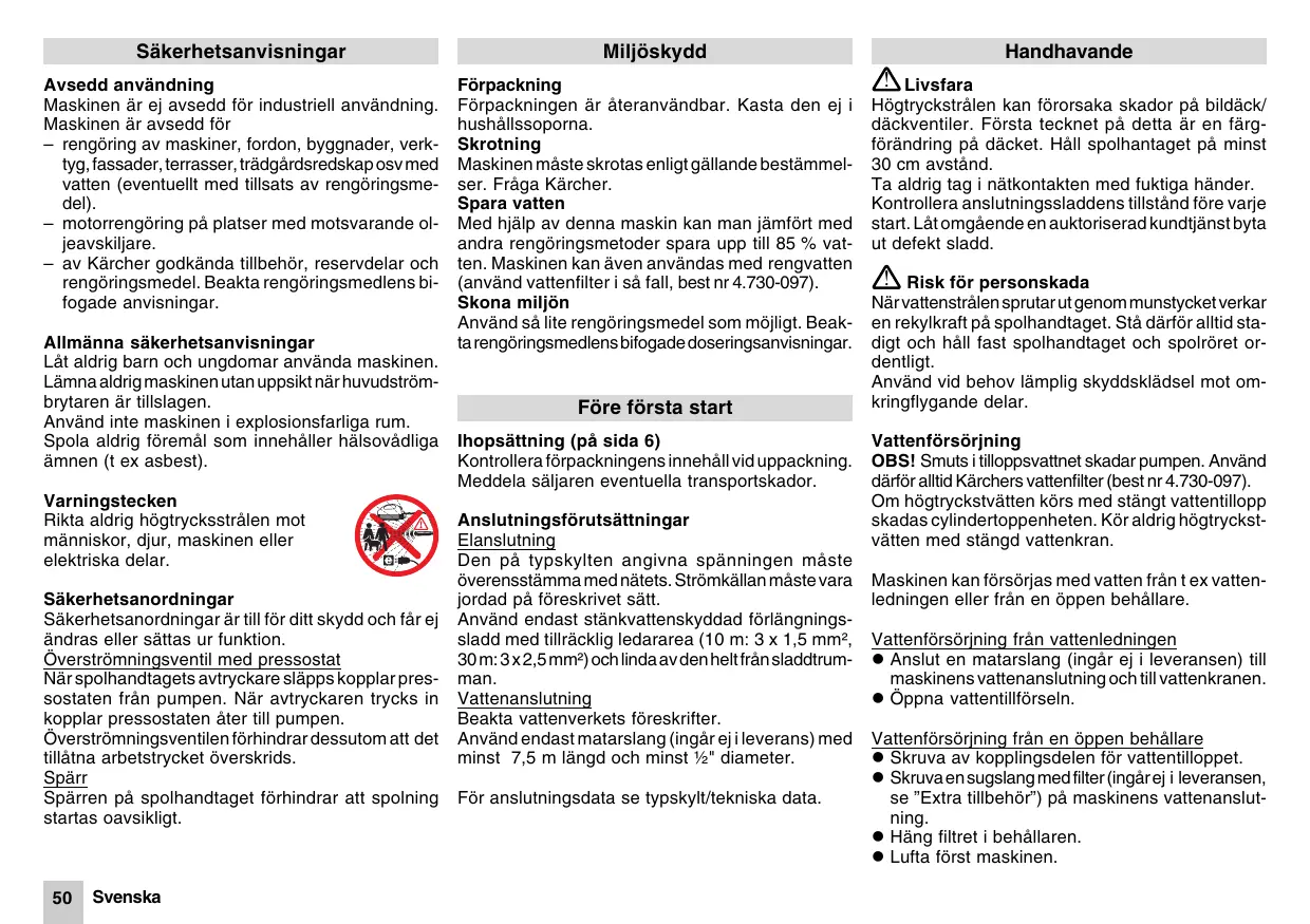 Säkerhetsanvisningar Avsedd användning Maskinen är ej avsedd för industriell användning. Maskinen är avsedd för – rengöring av maskiner, fordon, byggnader, verktyg, fassader, terrasser, trädgårdsredskap osv med vatten (eventuellt med tillsats av rengöringsmedel). – motorrengöring på platser med motsvarande oljeavskiljare. – av Kärcher godkända tillbehör, reservdelar och rengöringsmedel. Beakta rengöringsmedlens bifogade anvisningar. Allmänna säkerhetsanvisningar Låt aldrig barn och ungdomar använda maskinen. Lämna aldrig maskinen utan uppsikt när huvudströmbrytaren är tillslagen. Använd inte maskinen i explosionsfarliga rum. Spola aldrig föremål som innehåller hälsovådliga ämnen (t ex asbest). Varningstecken Rikta aldrig högtrycksstrålen mot människor, djur, maskinen eller elektriska delar. Säkerhetsanordningar Säkerhetsanordningar är till för ditt skydd och får ej ändras eller sättas ur funktion. Överströmningsventil med pressostat När spolhandtagets avtryckare släpps kopplar pressostaten från pumpen. När avtryckaren trycks in kopplar pressostaten åter till pumpen. Överströmningsventilen förhindrar dessutom att det tillåtna arbetstrycket överskrids. Spärr Spärren på spolhandtaget förhindrar att spolning startas oavsikligt.