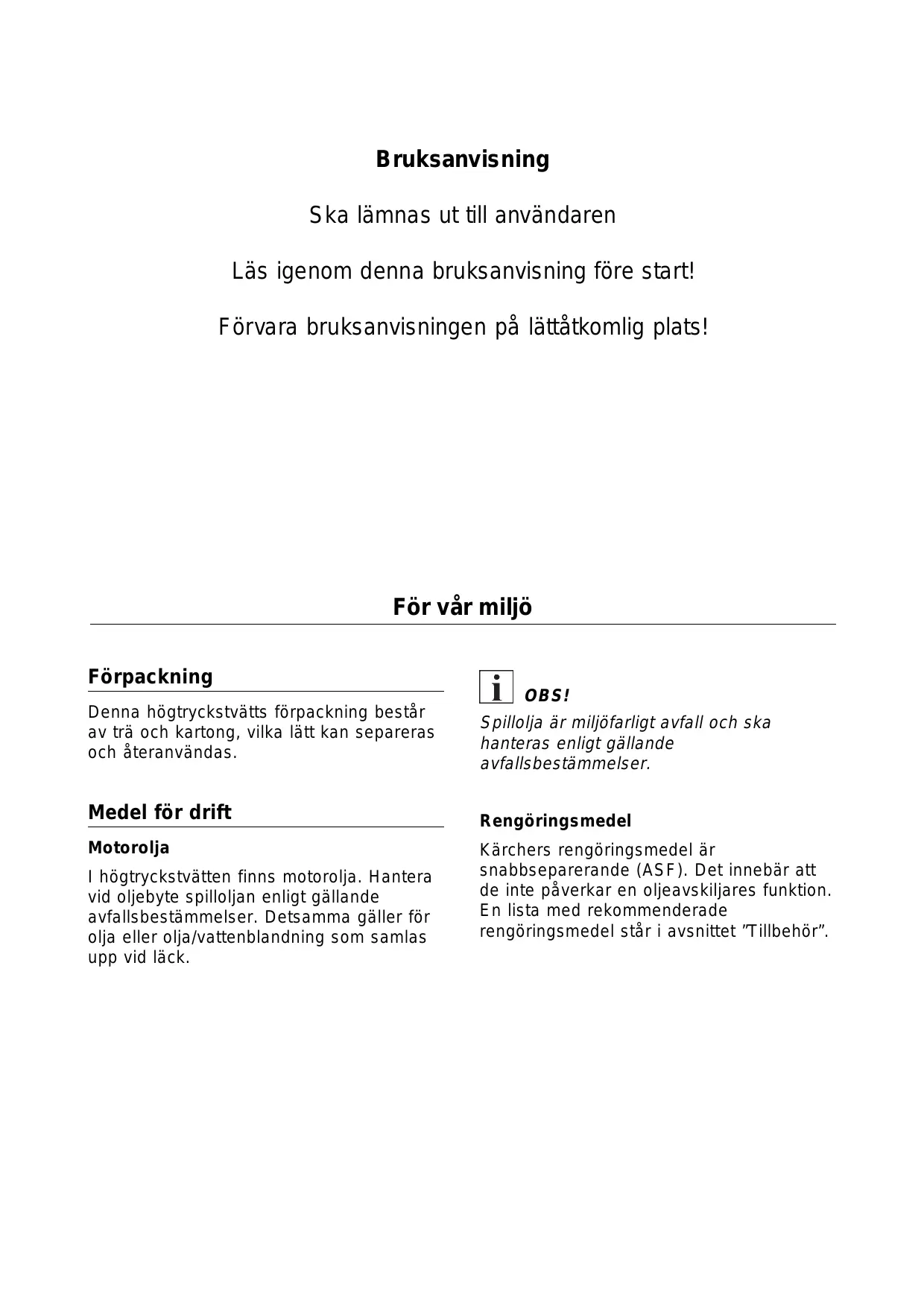 Bruksanvisning Ska lämnas ut till användaren Läs igenom denna bruksanvisning fôre start! Fôrvara bruksanvisningen pà lättätkomlig plats! Fôr vâr miljô Fôrpackning Denna hôgtryckstvätts fôrpackning bestär av trä och kartong, vilka lâtt kan separeras och äteranvändas. Medel fôr drift L' o8s! Motorolja l'hôgtryckstvätten finns motorolja. Hantera vid oljebyte spilloljan enligt gällande avfallsbestämmelser. Detsamma gäller fôr olja eller olja/vattenblandning som samlas upp vid läck. Spillolja är miljôfarligt avfall och ska hanteras enligt gällande avfallsbestämmelser. Rengôringsmedel Kärchers rengôringsmedel är snabbseparerande (ASF). Det innebär att de inte päverkar en oljeavskiljares funktion. En lista med rekommenderade rengôringsmedel stèr i avsnittet "Tillbehôr”.