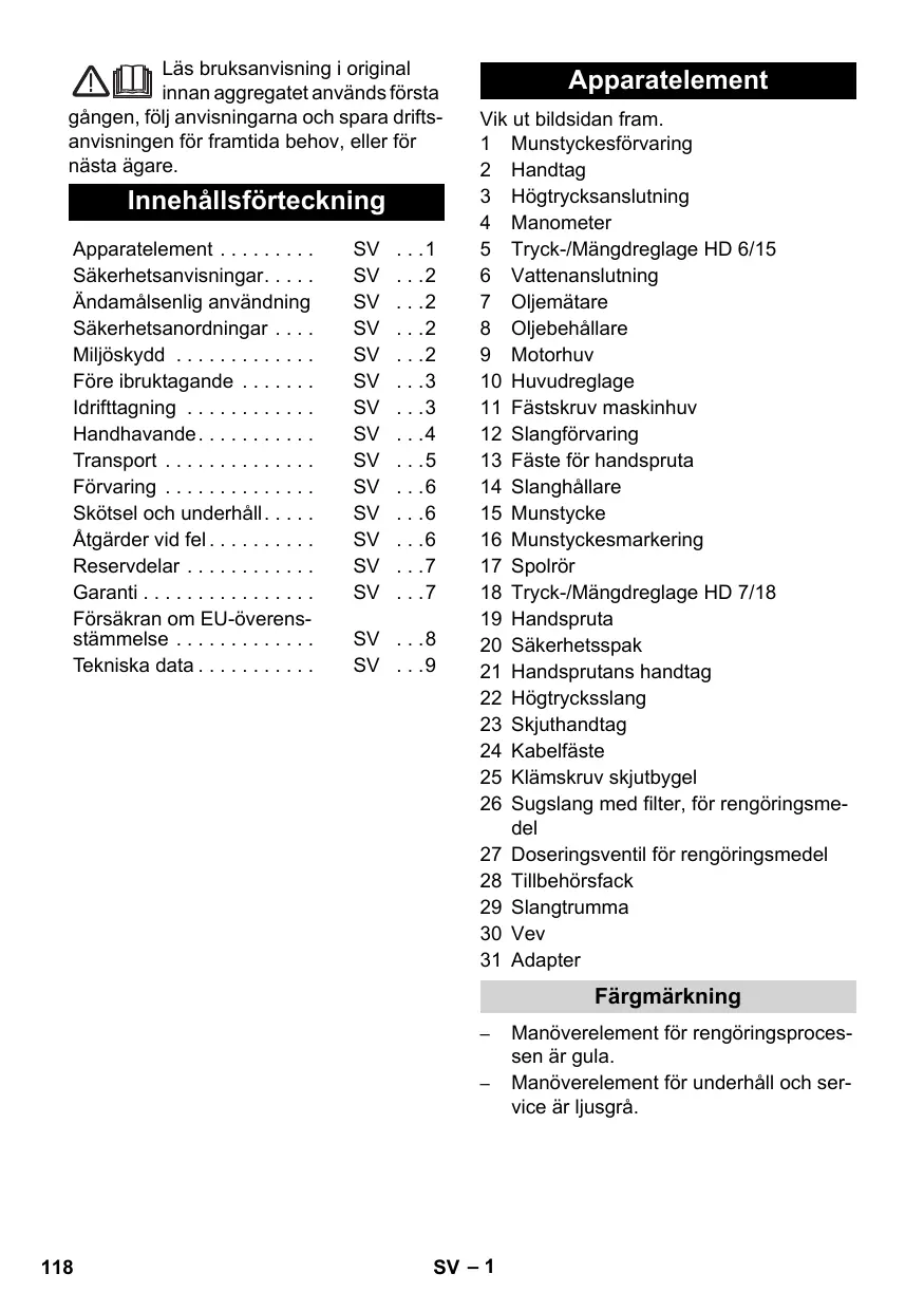 SV . . .8 SV . . .9 Apparatelement Vik ut bildsidan fram. 1 Munstyckesförvaring 2 Handtag 3 Högtrycksanslutning 4 Manometer 5 Tryck-/Mängdreglage HD 6/15 6 Vattenanslutning 7 Oljemätare 8 Oljebehållare 9 Motorhuv 10 Huvudreglage 11 Fästskruv maskinhuv 12 Slangförvaring 13 Fäste för handspruta 14 Slanghållare 15 Munstycke 16 Munstyckesmarkering 17 Spolrör 18 Tryck-/Mängdreglage HD 7/18 19 Handspruta 20 Säkerhetsspak 21 Handsprutans handtag 22 Högtrycksslang 23 Skjuthandtag 24 Kabelfäste 25 Klämskruv skjutbygel 26 Sugslang med filter, för rengöringsmedel 27 Doseringsventil för rengöringsmedel 28 Tillbehörsfack 29 Slangtrumma 30 Vev 31 Adapter Färgmärkning