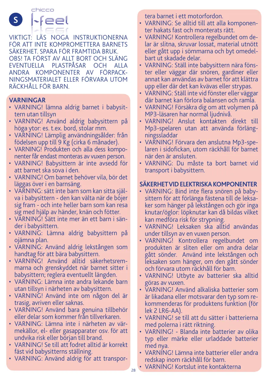- VARNING! Babysittern är inte avsedd för att barnet ska sova i den.