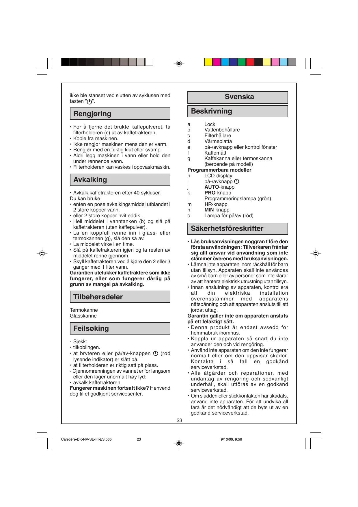 9/10/06, 9:56 Anmärkning för båda lägena: Kaffebryggaren stängs automatiskt av efter två timmar om du inte har stängt av den med knappen " " när kaffet är färdigbryggt. Apparaten fungerar fortfarande inte? Kontakta en godkänd serviceverkstad. Var rädd om miljön! Rengöring