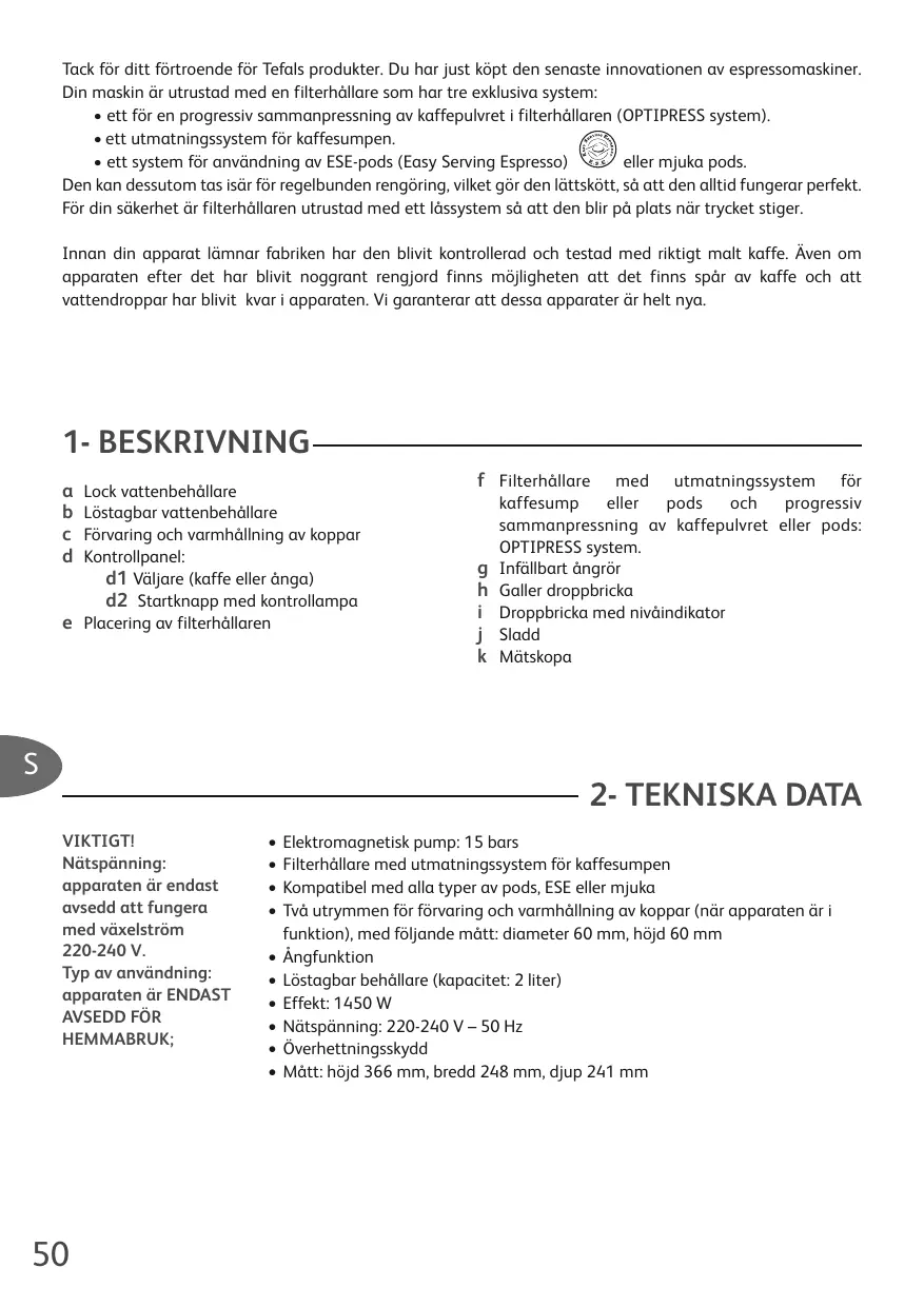Tack for ditt frotroende for Tefals produit. Du har just kopt den senaste innovationen av espressomaskiner. Din maskin ar utrustad med en filterhallare som har tre exklusiva system: