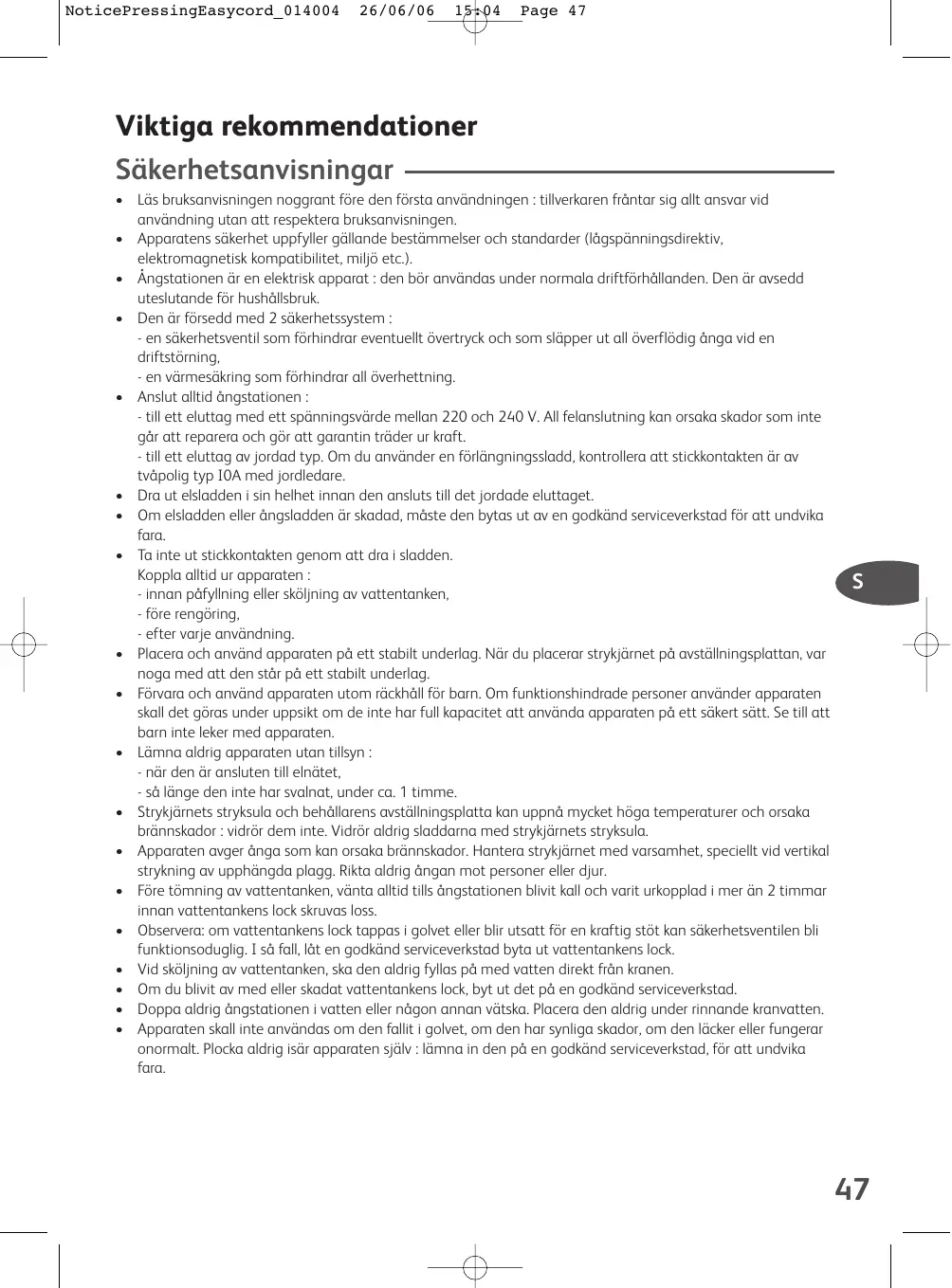 NoticePressingEasycord_ 014004 26/06/06 & Page 47 Viktiga rekommendationer Säkerhetsanvisningar + Läs bruksanvisningen noggrant fôre den fôrsta användningen : tillverkaren fräntar sig alt ansvar vid användning utan att respektera bruksanvisningen + Apparatens säkerhet uppfyller gällande bestämmelser och standarder (lagspänningsdirektiv, elektromagnetisk kompatibilitet, miljô etc.). + Angstationen är en elektrisk apparat : den bôr användas under normala driftfôrhällanden. Den är avsedd uteslutande für hushällsbruk. + Den àr frsedd med 2 säkerhetssystem - en säkerhetsventil som fôrhindrar eventuellt évertryck och som släpper ut all äverflädig änga vid en driftstôming, - en värmesäkring som fôrhindrar all ôverhettning. «_ Anslut alltid ängstationen - till ett eluttag med ett spänningsvärde mellan 220 och 240 V. All felanslutning kan orsaka skador som inte gär at reparera och gôr att garantin träder ur kraft. - till ett eluttag av jordad typ. Om du använder en fôrlängningssladd, kontrollera att stickkontakten är av tväpolig typ I0A med jordiedare. +. Dra ut elsladden i sin helhet innan den ansluts till det jordade eluttaget. +. Om elsladden eller ängsladden är skadad, mäste den bytas ut av en godkänd serviceverkstad fôr att undvika fara. + Tainte ut stickkontakten genom att dra i sladden. Koppla altid ur apparaten - innan päfylning eller skôljning av vattentanken, - füre rengôring. - efter varje användning, +. Placera och använd apparaten à ett stabilt underlag. När du placerar strykjärnet pà avställningsplattan, var noga med att den stär pà ett stabilt underlag + Fôrvara och använd apparaten utom räckhäll fr barn. Om funktionshindrade personer använder apparaten skall det gôras under uppsikt om de inte har full kapacitet att använda apparaten pà tt säkert sätt. Se til att barn inte leker med apparaten + Lämna aldrig apparaten utan tillsyn - när den är ansluten till elnätet, - sà länge den inte har svalnat, under ca. 1 timme + Strykjämets stryksula och behällarens avställningsplatta kan uppnä mycket hôga temperaturer och orsaka brännskador : vidrär dem inte. Vidrr aldrig sladdama med strykjämnets stryksula. + Apparaten avger änga som kan orsaka brännskador. Hantera strykjämet med varsamhet, speciell vid vertikal strykning av upphängda plagg Rikta aldrig ängan mot personer eller djur. + Fôre tômning av vattentanken, vänta alltid tills ängstationen blivit Kall och varit urkopplad i mer än 2 timmar innan vattentankens lock skruvas loss. + Observera: om vattentankens lock tappas i golvet eller blir utsatt fôr en kraftig stôt kan säkerhetsventilen bli funktionsoduglig. 1 sà fall làt en godkänd serviceverkstad byta ut vattentankens lock. + Vid skôljning av vattentanken, ska den alchrig fyllas pà med vatten direkt frân kranen + Om du blivit av med eller skadat vattentankens lock, byt ut det pà en godkänd serviceverkstad + Doppa aldrig ängstationen i vatten eller nägon annan vätska. Placera den aldrig under rinnande kranvatten. + Apparaten skall inte användas om den falit i golvet, om den har synliga skador, om den läcker eller fungerar onormalt. Plocka aldrig isär apparaten själv : lämna in den pà en godkänd serviceverkstad, fôr att undvika fara.