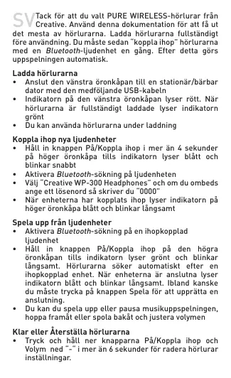 • • Raccordez l’écouteur gauche à votre ordinateur portable ou à votre ordinateur avec le câble USB fourni • Le voyant de l’écouteur gauche s’allume en rouge. Lorsque la charge est complète, le voyant devient vert. • Vous pouvez utiliser le casque pendant la charge Appariement de nouveaux périphériques audio • Appuyez sur le bouton de mise sous tension / appariement sur l’écouteur droit et maintenez-le enfoncé pendant plus de 4 secondes, jusqu’à ce que le voyant s’allume en bleu et clignote rapidement • Activez la fonction de recherche Bluetooth sur votre périphérique audio • Sélectionnez « Creative WP-300 Headphones » et, si un mot de passe vous est demandé, tapez « 0000 » • Une fois l’appariement effectué, le voyant bleu sur l’écouteur droit clignote lentement Lecture à partir des périphériques audio • Activez la fonction Bluetooth sur votre périphérique audio apparié • Appuyez sur le bouton de mise sous tension / appariement sur l’écouteur droit maintenez-le enfoncé jusqu’à ce que le voyant s’allume en vert et clignote lentement. Le casque recherche automatiquement le dernier périphérique apparié. Une fois la connexion établie, le voyant devient bleu et clignote lentement. Dans certains cas, il peut être nécessaire d’appuyer sur le bouton de lecture pour établir la connexion. • Vous pouvez à présent écouter ou mettre en pause la musique, sauter des pistes vers l’avant ou vers l’arrière, et régler le volume