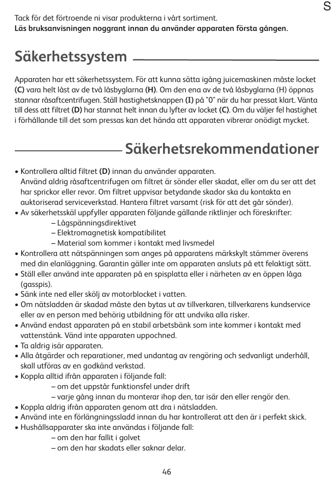 Apparaten har att sakerhetssystem. For att kunna satta igang jacemaskinen maste locket (C) vara helt LAST av de två lásbyglarna (H). Om den ena av de två lásbyglarna (H) öppnas stannar rasaftcentrifugen. Ställ hastighetsnappen (I) på "0" när du har pressat klart. Vänta till dess att filtre (D) har stannat helt innan du lyfter av locket (C). Om du väljer fel hastighet i forhällande till det som pressas kan det Handa att apparaten vibrarer onödig mycket.