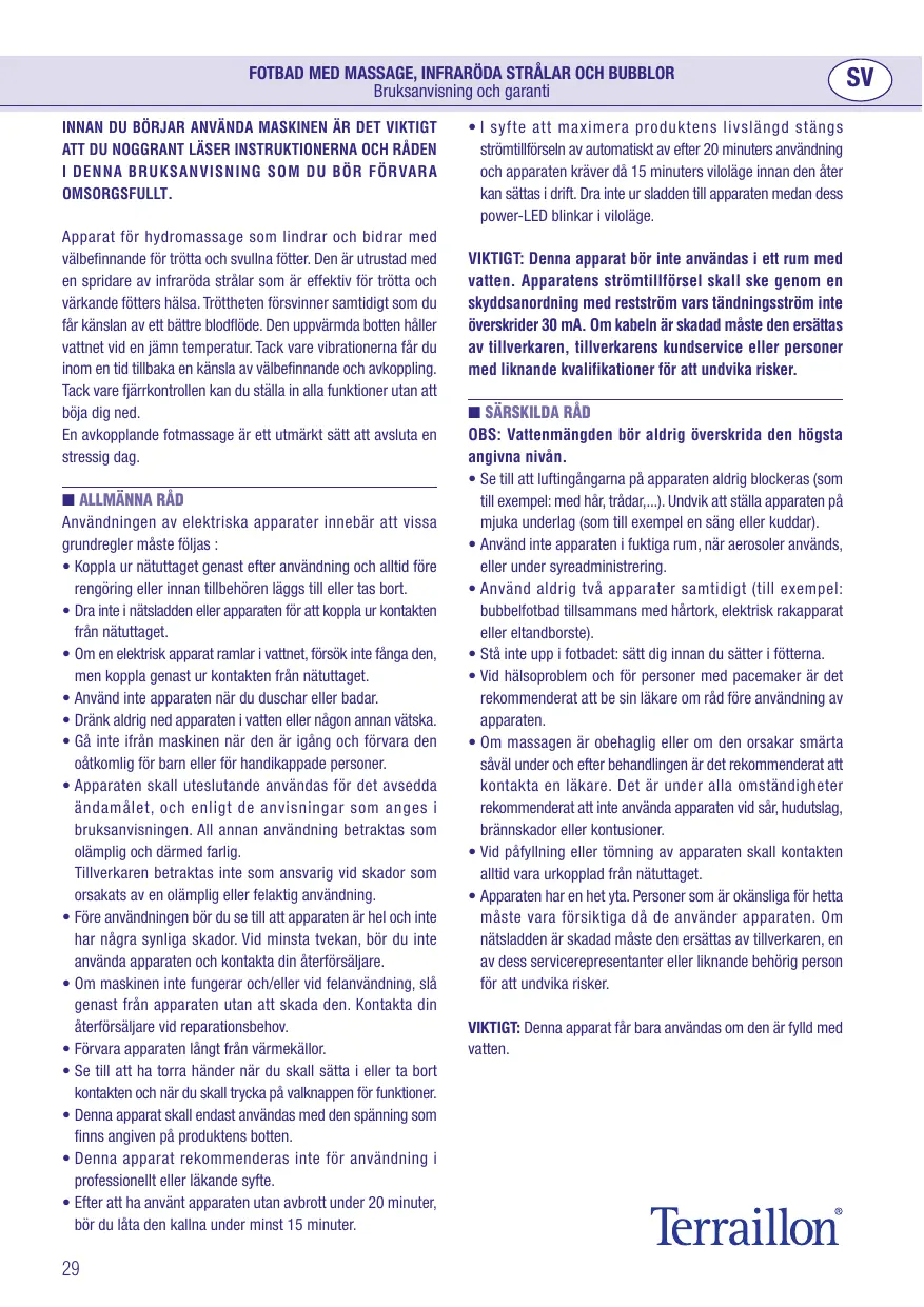 • Cet appareil n’est pas recommandé pour des utilisations à des fins professionnelles ou curatives. • Après avoir utilisé l’appareil sans interruption pendant une durée de 20 minutes, il est nécessaire de le laisser refroidir pendant au moins 15 minutes. • Pour optimiser la durée de vie du produit, l’alimentation s’arrête automatiquement après 20 minutes d’utilisation et ne se remet en marche qu’après 15 minutes d’attente. Ne débranchez pas l’appareil lorsque la diode d’alimentation clignote durant cette période d’attente. IMPORTANT : Cet appareil ne doit pas être utilisé dans une salle d’eau. L’appareil devrait être alimenté par l’intermédiaire d’un dispositif à courant différentiel résiduel ayant un courant de déclenchement n’excédant pas 30 mA. Si le câble est endommagé, il doit être remplacé par le fabricant, son service après-vente ou des personnes de qualifications similaires afin d’éviter le danger. ■ CONSEILS PARTICULIERS ATTENTION : La quantité d’eau ne doit jamais dépasser le niveau maximum indiqué. • Faites attention que les entrées d’air sur le fond de l’appareil ne soient jamais bouchées (comme par exemple : des cheveux, des fils,…) ; éviter de poser l’appareil sur des superficies molles (comme par exemple: lit ou coussins ). • Ne pas utiliser l’appareil dans des endroits humides ou durant l’utilisation d’aérosols ou administration d’oxygène. • N’utiliser en aucun cas deux appareils en même temps (par exemple : hydromassage plantaire et sèche-cheveux, hydromassage plantaire et rasoir électrique ou brosse à dents électrique). • Ne pas se mettre debout dans l’hydromasseur : s’asseoir avant de mettre les pieds dans l’eau. • En cas de problèmes de santé et pour les personnes munis de pacemaker, il est recommandé de consulter son médecin avant toute utilisation de l’appareil. • Dans le cas où le massage est désagréable ou s’il provoque des douleurs aussi bien durant qu’après le traitement, il est conseillé de consulter son médecin. Dans tous les cas, il est recommandé de ne pas utiliser l’appareil en présence de blessures, éruptions cutanées, brûlures ou contusions. • Durant les opérations de remplissage et de vidange, la prise doit toujours être débranchée de la prise de courant. IMPORTANT : Cet appareil ne doit fonctionner qu’avec de l’eau.