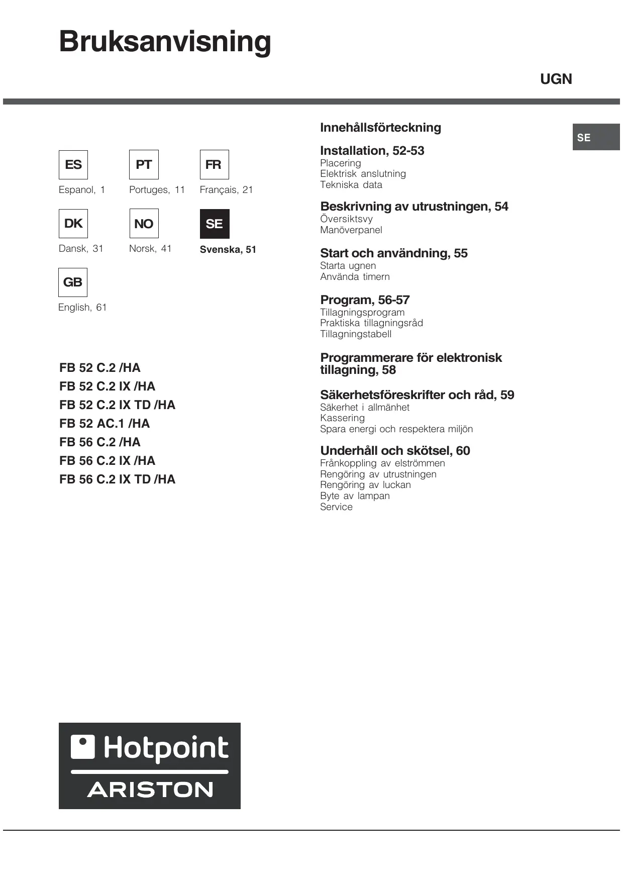 English, 61 FB 52 C.2 /HA FB 52 C.21X /HA FB 52 C.21X TD /HA FB 52 AC.1 /HA FB 56 C.2 /HA FB 56 C.2 IX /HA FB 56 C.2 IX TD /HA B Hotpoint ARISTON UGN Innehällsfôrteckning Installation, 52-53 Placering Elektrisk anslutning Tekniska data Beskrivning av utrustningen, 54 Ôversiktsvy Manôverpanel Start och användning, 55 Starta ugnen Använda timern Program, 56-57 Tillagningsprogram Praktiska tilagningsräd Tillagningstabell Programmerare fôr elektronisk tillagning, 58 Säkerhetsfôreskrifter och räd, 59 Säkerhet i allmänhet Kassering Spara energi och respektera miljôn Underhäll och skôtsel, 60 Fränkoppling av elstrômmen Rengèring av utrustningen Rengüring av luckan Byte av lampan Service