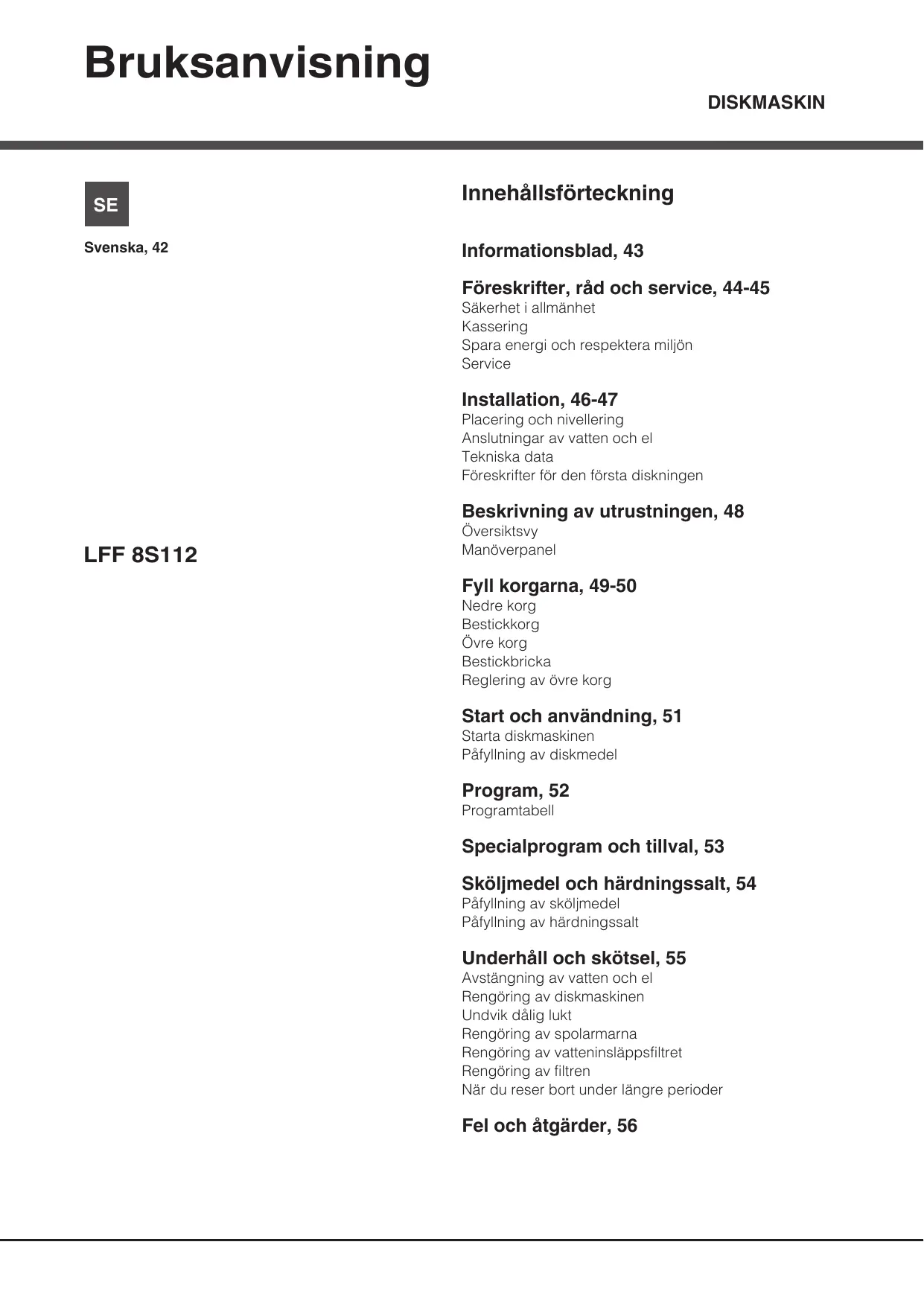Bruksanvisning DISKMASKIN se. Innehällsfôrteckning Svenska, 42 Informationsblad, 43 Fôreskrifter, räd och service, 44-45 Säkerhet i allmänhet Kassering Spara energi och respektera miljôn Service Installation, 46-47 Placering och nivellering Anslutningar av vatten och el Tekniska data Füreskrifter fr den fôrsta diskningen Beskrivning av utrustningen, 48 Oversiktsvy LFF 8S112 Manëverpanel FyIl korgarna, 49-50 Nedre korg Bestickkorg Ovre korg Bestickbricka Regjlering av ôvre korg Start och användning, 51 Starta diskmaskinen Päfylining av diskmedel Program, 52 Programtabell Specialprogram och tillval, 53 Skôljimedel och härdningssalt, 54 Päfylining av skôljmedel Päfylining av härdningssalt Underhäll och skôtsel, 55 Avstängning av vatten och el Rengüring av diskmaskinen Undvik dälig lukt Rengüring av spolarmarna Rengôring av vatteninsläppsfiltret Rengôring av filtren När du reser bort under längre perioder Fel och âtgärder, 56