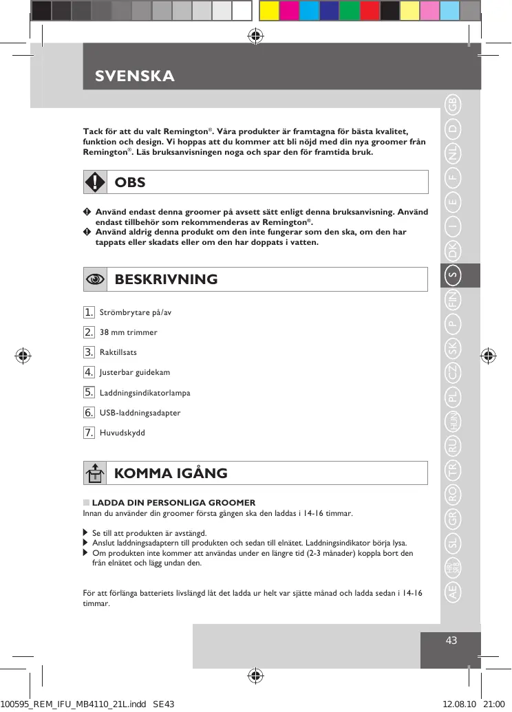 I E OBS F Tack för att du valt Remington®. Våra produkter är framtagna för bästa kvalitet, funktion och design. Vi hoppas att du kommer att bli nöjd med din nya groomer från Remington®. Läs bruksanvisningen noga och spar den för framtida bruk.