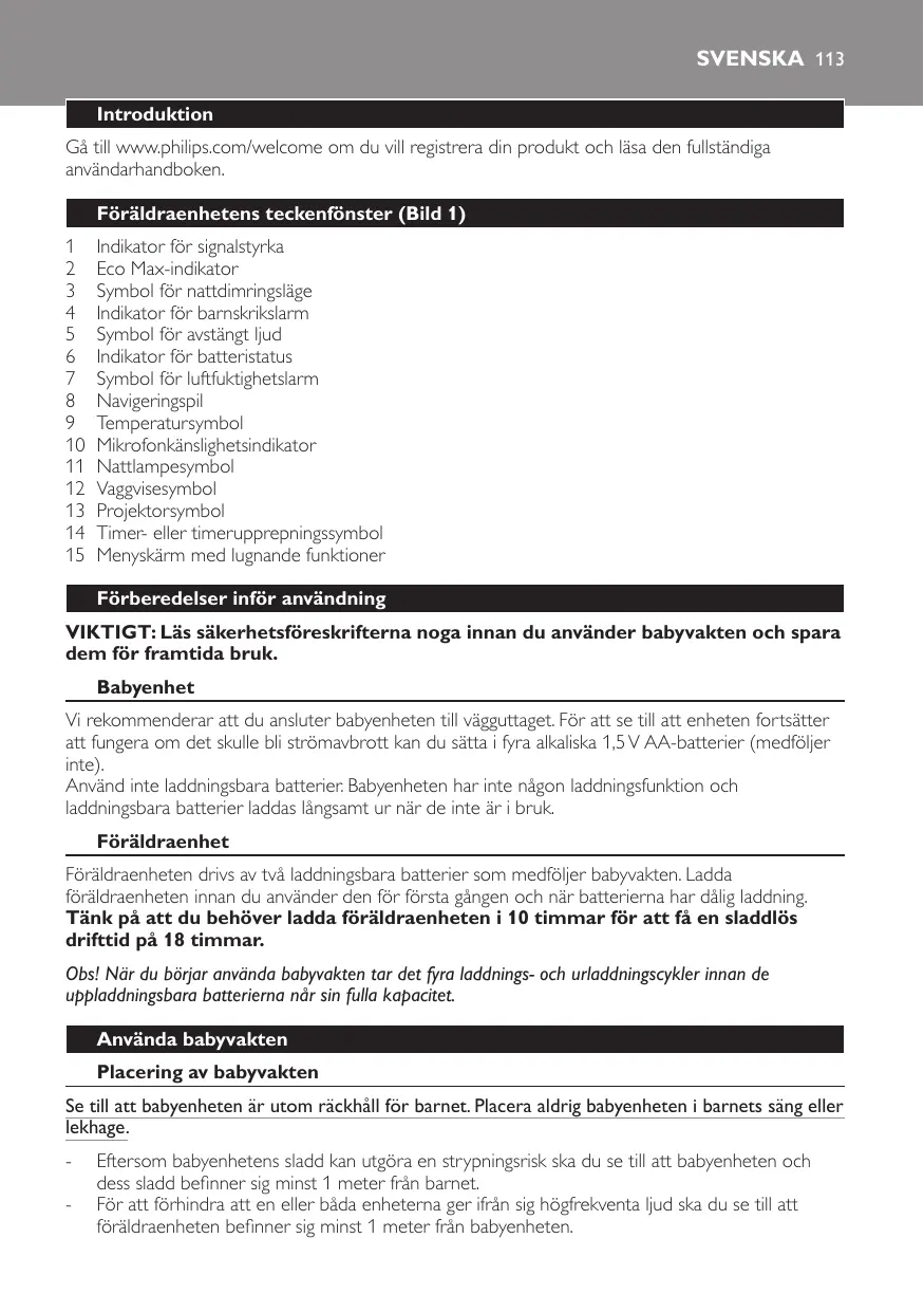 Indikator för signalstyrka Eco Max-indikator Symbol för nattdimringsläge Indikator för barnskrikslarm Symbol för avstängt ljud Indikator för batteristatus Symbol för luftfuktighetslarm Navigeringspil Temperatursymbol Mikrofonkänslighetsindikator Nattlampesymbol Vaggvisesymbol Projektorsymbol Timer- eller timerupprepningssymbol Menyskärm med lugnande funktioner Förberedelser inför användning VIKTIGT: Läs säkerhetsföreskrifterna noga innan du använder babyvakten och spara dem för framtida bruk. Babyenhet Vi rekommenderar att du ansluter babyenheten till vägguttaget. För att se till att enheten fortsätter att fungera om det skulle bli strömavbrott kan du sätta i fyra alkaliska 1,5 V AA-batterier (medföljer inte). Använd inte laddningsbara batterier. Babyenheten har inte någon laddningsfunktion och laddningsbara batterier laddas långsamt ur när de inte är i bruk. Föräldraenhet Föräldraenheten drivs av två laddningsbara batterier som medföljer babyvakten. Ladda föräldraenheten innan du använder den för första gången och när batterierna har dålig laddning. Tänk på att du behöver ladda föräldraenheten i 10 timmar för att få en sladdlös drifttid på 18 timmar. Obs! När du börjar använda babyvakten tar det fyra laddnings- och urladdningscykler innan de uppladdningsbara batterierna når sin fulla kapacitet. Använda babyvakten Placering av babyvakten Se till att babyenheten är utom räckhåll för barnet. Placera aldrig babyenheten i barnets säng eller lekhage. -- Eftersom babyenhetens sladd kan utgöra en strypningsrisk ska du se till att babyenheten och dess sladd befinner sig minst 1 meter från barnet. -- För att förhindra att en eller båda enheterna ger ifrån sig högfrekventa ljud ska du se till att föräldraenheten befinner sig minst 1 meter från babyenheten. 114 Svenska Ansluta föräldraenheten och babyenheten 1 Håll ned knappen 3 på babyenheten i 2 sekunder tills strömlampan tänds. 2 Håll ned knappen 3 på föräldraenheten i 2 sekunder tills teckenfönstret tänds. anslutningslampan på föräldraenheten börjar blinka rött och meddelandet “I AM LINKING” (ansluter) visas i teckenfönstret. ,, När föräldraenheten och babyenheten är anslutna lyser anslutningslampan med fast grönt sken. Indikatorn för signalstyrka och meddelandet “LINKED” (ansluten) visas i teckenfönstret. ,, Om ingen anslutning upprättas visas meddelandet “NOT LINKED” (ej ansluten) och föräldraenheten börjar pipa. Så här gör du om ingen anslutning upprättas -- Om föräldraenheten är utom babyenhetens räckvidd placerar du den närmare babyenheten, men inte närmare än 1 meter. -- Om baby- eller föräldraenheten är för nära en annan DECT-apparat (t.ex. en sladdlös telefon) stänger du av den apparaten eller flyttar enheten så att den inte står för nära apparaten. -- Om babyenheten är avstängd startar du den. Räckvidd -- Räckvidden är 330 meter utomhus och upp till 50 meter inomhus. -- Babyvaktens räckvidd varierar beroende på omgivningen och faktorer som orsakar störning. Våta och fuktiga material orsakar så mycket störning att räckvidden kan minska med upp till 100 %. Uppgifter om störningar från torra material hittar du i tabellen nedan. Torra material Materialtjocklek Sämre räckvidd Trä, murbruk, papp, glas (utan metall, ledningar eller bly) < 30 cm 0–10 % Tegel, plywood < 30 cm 5–35 % Armerad betong < 30 cm 30–100 % Metallgaller < 1 cm 90–100 % Metall- eller aluminiumplattor < 1 cm 100 % Babyenhetens funktioner och signaler Nattlampa Nattlampan ger ett mjukt sken som lugnar barnet. 1 Tryck på knappen Q på babyenheten för att slå på eller stänga av nattlampan. Vaggvisefunktion 1 Tryck på knappen K på babyenheten för att spela upp den senast valda vaggvisan. Den valda vaggvisan spelas under den tid som är inställd. (Bild 2) 2 Tryck på knappen ►| om du vill välja en annan vaggvisa från listan. (Bild 3) 3 Ändra ljudnivån på vaggvisan genom att trycka på volymknapparna + och – på babyenheten (Bild 4). Obs! Du kan bara ställa in högtalarvolymen på babyenheten när en vaggvisa spelas upp. Om du ställer in volymen för vaggvisan högre blir ljudet också högre när du använder talfunktionen på föräldraenheten. 4 För att avbryta uppspelningen av vaggvisan trycker du på knappen K på babyenheten. Svenska 115 Projektor Med hjälp av projektorfunktionen kan du lugna ditt barn med ljusmönster i färg som projiceras i taket. 1 Tryck på på/av-knappen för projektorn för att sätta igång projektorn. Projektorsymbolen visas i föräldraenhetens teckenfönster (Bild 5). ,, Det finns sex olika mönster. Det första mönstret tonar in och når full intensitet på 2 sekunder. Det visas i 8 sekunder och tonar sedan ut i 2 sekunder medan nästa mönster tonar in.Varje mönster projiceras i 10 sekunder. Mönstren upprepas under den tid som är inställd (Bild 6). 2 Stäng av projektorn genom att trycka på på/av-knappen för projektorn. Sökning av föräldraenheten Om du har förlagt föräldraenheten kan du använda knappen FIND på babyenheten för att hitta den. Den här funktionen fungerar bara när föräldraenheten är på. 1 Tryck på FIND på babyenheten, så ger föräldraenheten ifrån sig en söksignal (Bild 7). 2 Du stänger av söksignalen genom att trycka på FIND på babyenheten eller trycka på valfri knapp på föräldraenheten. Söksignalen tystnar automatiskt efter 2 minuter. Batteristatuslampa 1 Batteristatuslampan lyser med fast, grönt sken när babyenheten drivs med batteri och batterinivån är tillräcklig. 2 Batteristatuslampan blinkar snabbt rött om babyenheten drivs med batteri och batterierna är svaga. Byt ut batterierna när de håller på att ta slut. Föräldraenhetens funktioner och signaler Meny med lugnande funktioner Föräldraenheten har en egen meny för de lugnande funktionerna: nattlampan, vaggvisefunktionen och projektorn. Du öpp