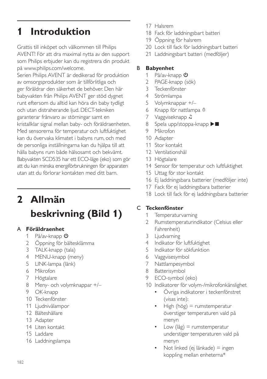 1 Introduktion Grattis till inköpet och välkommen till Philips AVENT! För att dra maximal nytta av den support som Philips erbjuder kan du registrera din produkt på www.philips.com/welcome. Serien Philips AVENT är dedikerad för produktion av omsorgsprodukter som är tillförlitliga och ger föräldrar den säkerhet de behöver. Den här babyvakten från Philips AVENT ger stöd dygnet runt eftersom du alltid kan höra din baby tydligt och utan distraherande ljud. DECT-tekniken garanterar frånvaro av störningar samt en kristallklar signal mellan baby- och föräldraenheten. Med sensorerna för temperatur och luftfuktighet kan du övervaka klimatet i babyns rum, och med de personliga inställningarna kan du hjälpa till att hålla babyns rum både hälsosamt och bekvämt. Babyvakten SCD535 har ett ECO-läge (eko) som gör att du kan minska energiförbrukningen för apparaten utan att du förlorar kontakten med ditt barn. 2 Allmän beskrivning (Bild 1) A Föräldraenhet 1 På/av-knapp 3 2 Öppning för bältesklämma 3 TALK-knapp (tala) 4 MENU-knapp (meny) 5 LINK-lampa (länk) 6 Mikrofon 7 Högtalare 8 Meny- och volymknappar +/– 9 OK-knapp 10 Teckenfönster 11 Ljudnivålampor 12 Bälteshållare 13 Adapter 14 Liten kontakt 15 Laddare 16 Laddningslampa