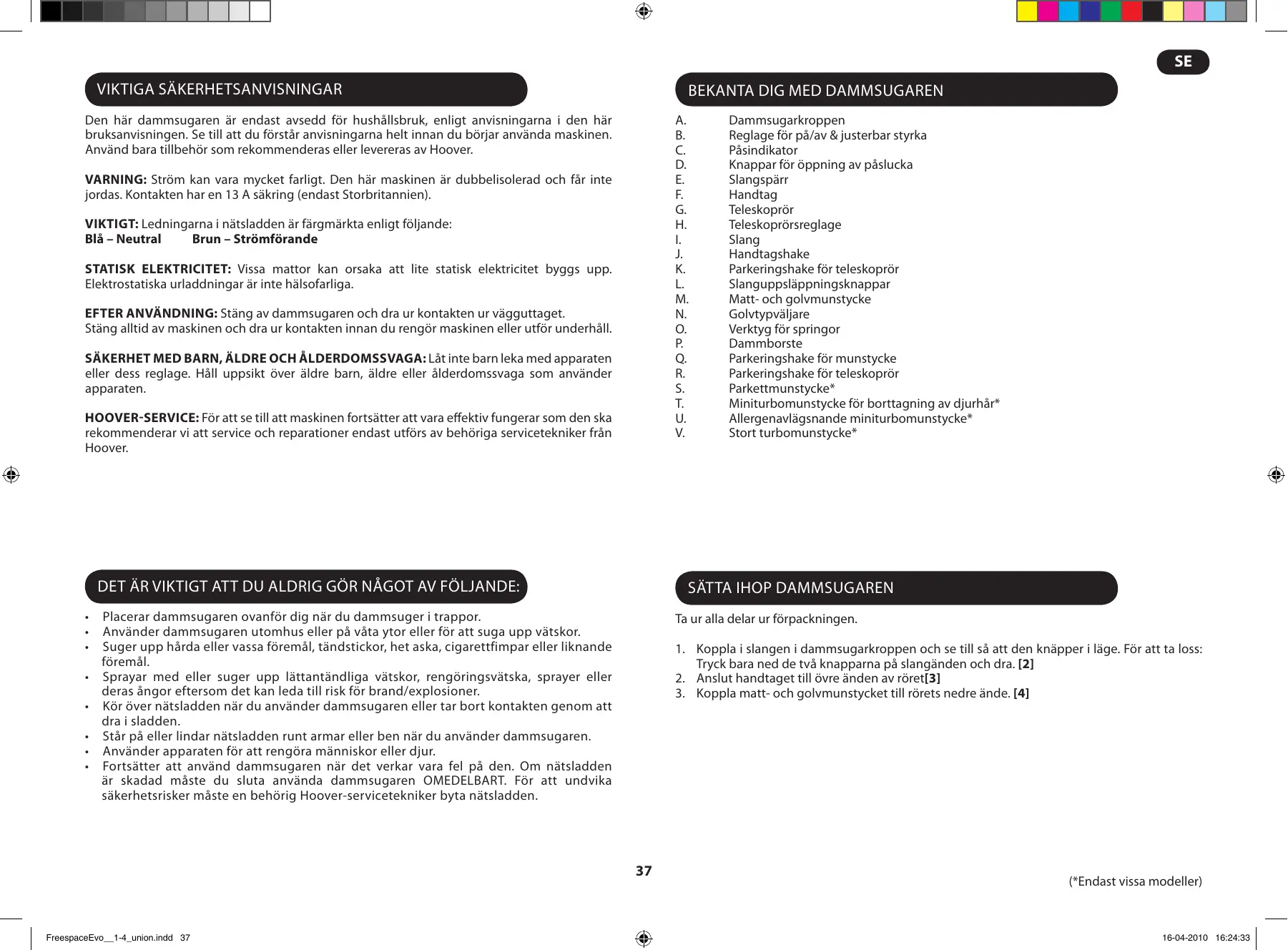 FreespaceEvo__1-4_union.indd 37 Dammsugarkroppen Reglage för på/av & justerbar styrka Påsindikator Knappar för öppning av påslucka Slangspärr Handtag Teleskoprör Teleskoprörsreglage Slang Handtagshake Parkeringshake för teleskoprör Slanguppsläppningsknappar Matt- och golvmunstycke Golvtypväljare Verktyg för springor Dammborste Parkeringshake för munstycke Parkeringshake för teleskoprör Parkettmunstycke* Miniturbomunstycke för borttagning av djurhår* Allergenavlägsnande miniturbomunstycke* Stort turbomunstycke* (*Endast vissa modeller) 16-04-2010 16:24:33