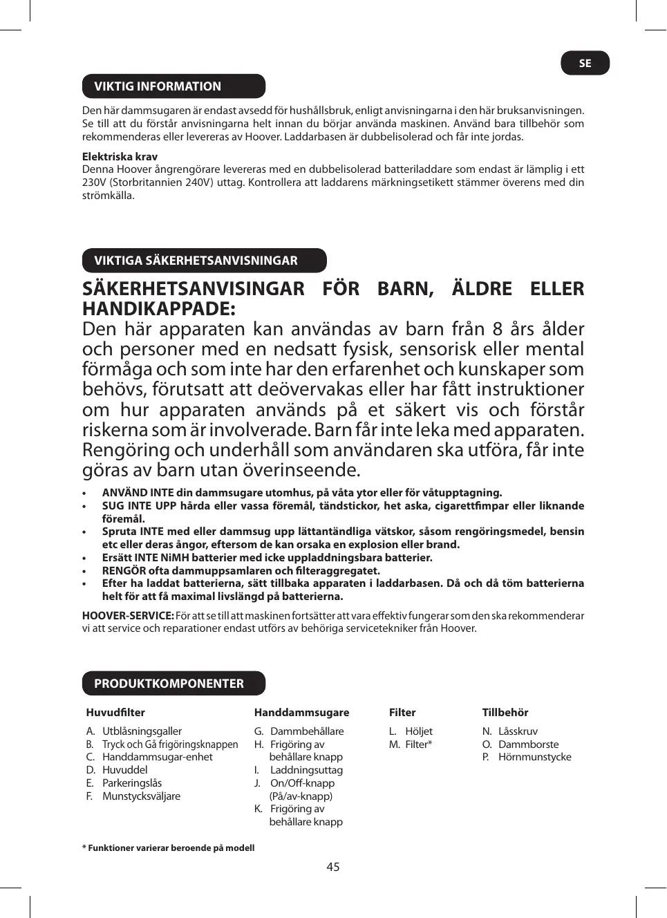 SE VIKTIG INFORMATION Den här dammsugaren är endast avsedd för hushållsbruk, enligt anvisningarna i den här bruksanvisningen. Se till att du förstår anvisningarna helt innan du börjar använda maskinen. Använd bara tillbehör som rekommenderas eller levereras av Hoover. Laddarbasen är dubbelisolerad och får inte jordas. Elektriska krav Denna Hoover ångrengörare levereras med en dubbelisolerad batteriladdare som endast är lämplig i ett 230V (Storbritannien 240V) uttag. Kontrollera att laddarens märkningsetikett stämmer överens med din strömkälla.