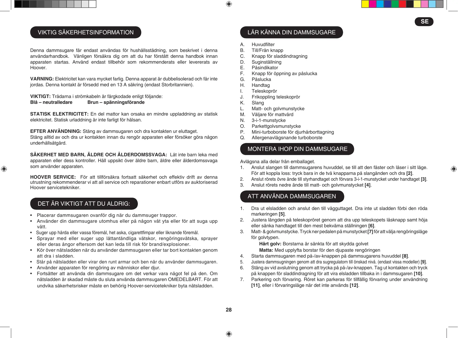 Denna dammsugare får endast användas för hushållsstädning, som beskrivet i denna användarhandbok. Vänligen försäkra dig om att du har förstått denna handbok innan apparaten startas. Använd endast tillbehör som rekommenderats eller levererats av Hoover. Varning: Elektricitet kan vara mycket farlig. Denna apparat är dubbelisolerad och får inte jordas. Denna kontakt är försedd med en 13 A säkring (endast Storbritannien). Viktigt: Trådarna i strömkabeln är färgkodade enligt följande: Blå – neutralledare Brun – spänningsförande STATISK ELEKTRICITET: En del mattor kan orsaka en mindre uppladdning av statisk elektricitet. Statisk urladdning är inte farligt för hälsan. EFTER ANVÄNDNING: Stäng av dammsugaren och dra kontakten ur eluttaget. Stäng alltid av och dra ur kontakten innan du rengör apparaten eller försöker göra någon underhållsåtgärd. Huvudfilter Till/Från knapp Knapp för sladdindragning Suginställning Påsindikator Knapp för öppning av påslucka Påslucka Handtag Teleskoprör Frikoppling teleskoprör Slang Matt- och golvmunstycke Väljare för mattvård 3-i-1-munstycke Parkettgolvsmunstycke Mini-turboborste för djurhårborttagning Allergenavlägsnande turboborste